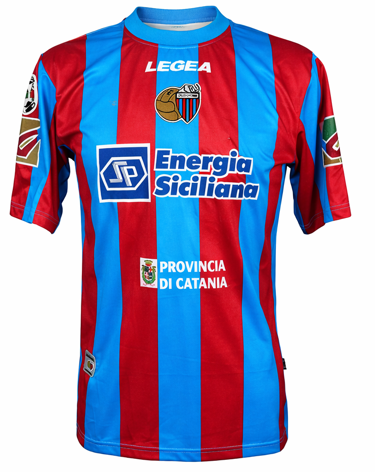 Maglia rappresentativa della stagione 2009-2010 del Catania, periodo di consolidamento del club in Serie A. La presenza delle patch ufficiali e delle specifiche da gara ne rafforza il valore collezionistico in un contesto legato alla storia recente rossazzurra.