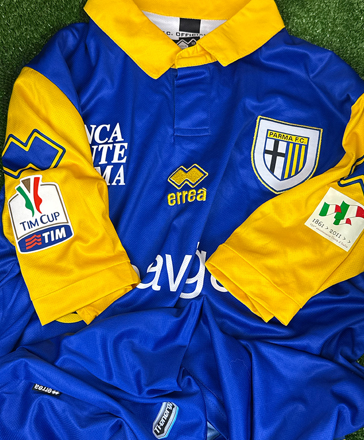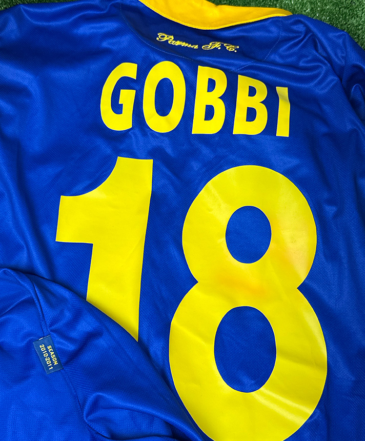Maglia Away del Parma FC personalizzata Gobbi della stagione 2010-2011, versione Player Issued con patch Tim Cup.