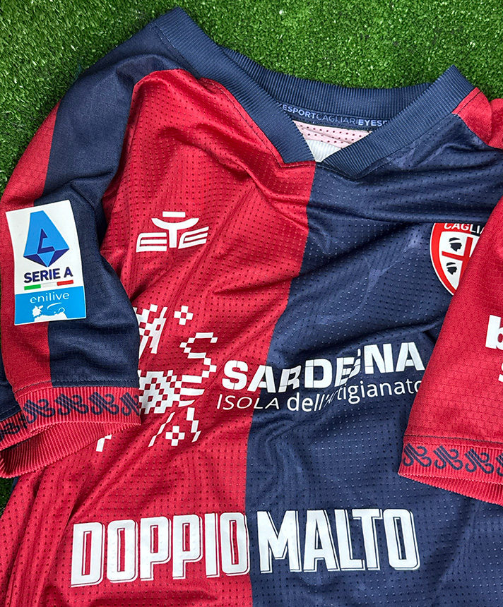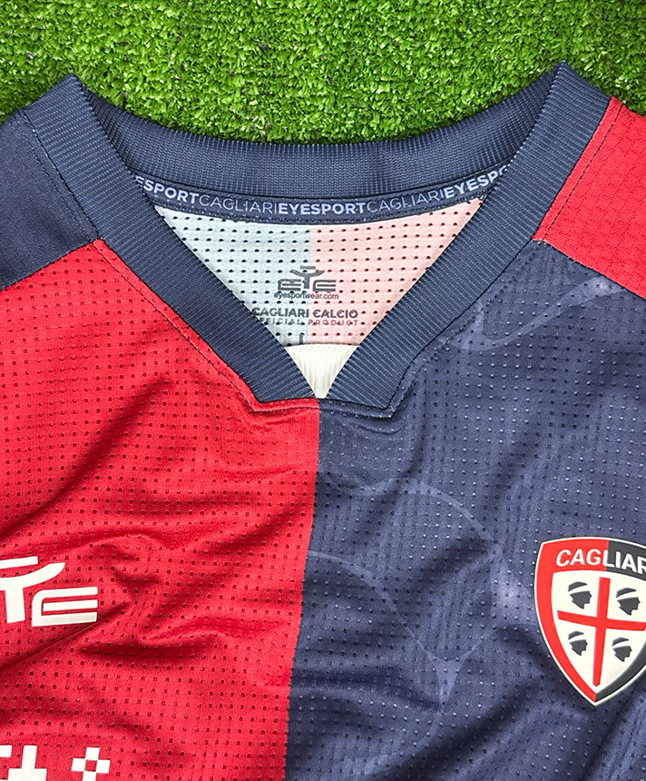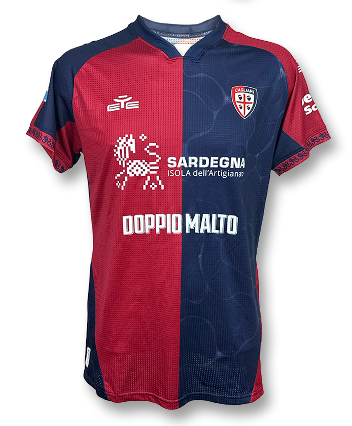 Maglia Home del Cagliari Calcio personalizzata Esposito della stagione 2025-2026, versione Player Issued con patch ufficiale Serie A.
