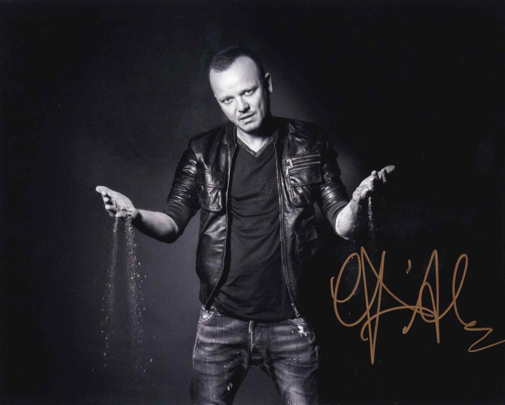 Autografo di Gigi D’Alessio su fotografia in bianco e nero che lo ritrae in posa scenica, firmata sul fronte.