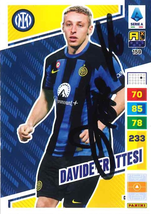 Autografo di Davide Frattesi su figurina Panini Adrenalyn 2023-24, centrocampista dell’Inter e campione d’Europa con l'Italia nel 2021.
