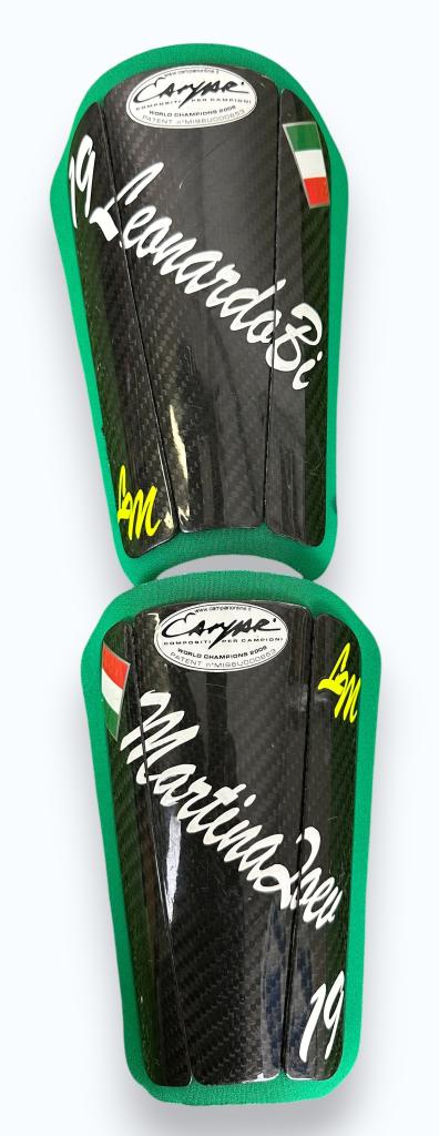 Coppia di parastinchi match worn e personalizzati di Leonardo Bonucci, originali e utilizzati in gara, memorabilia calcistica autentica.