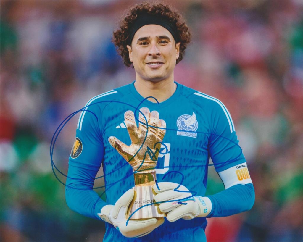 Autografo di Guillermo Ochoa su fotografia che lo ritrae con la maglia della Nazionale messicana mentre tiene tra le mani il trofeo della CONCACAF Gold Cup.