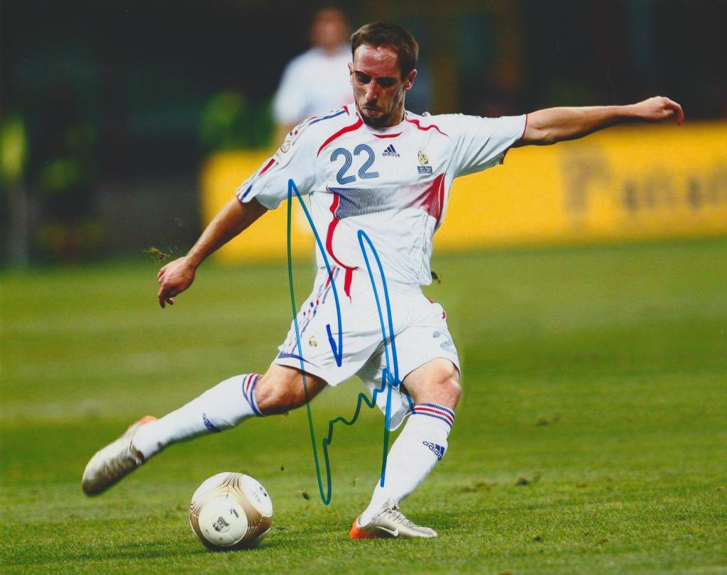 Autografo di Franck Ribéry su fotografia con maglia Francia. Attaccante del Bayern Monaco, vincitore della Champions League 2013.
