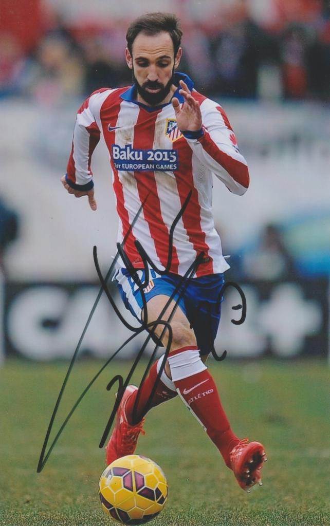 Autografo di Juanfran su fotografia a colori che lo ritrae in azione con la maglia dell’Atlético Madrid durante una fase di gioco mentre conduce il pallone sul terreno di gioco. Il calciatore indossa la tradizionale divisa biancorossa del club madrileno con il logo commemorativo delle competizioni disputate in quel periodo.