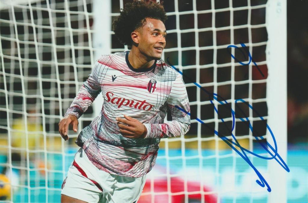 Autografo di Joshua Zirkzee su fotografia con maglia Bologna. Attaccante olandese cresciuto nel Bayern Monaco e protagonista in Serie A.