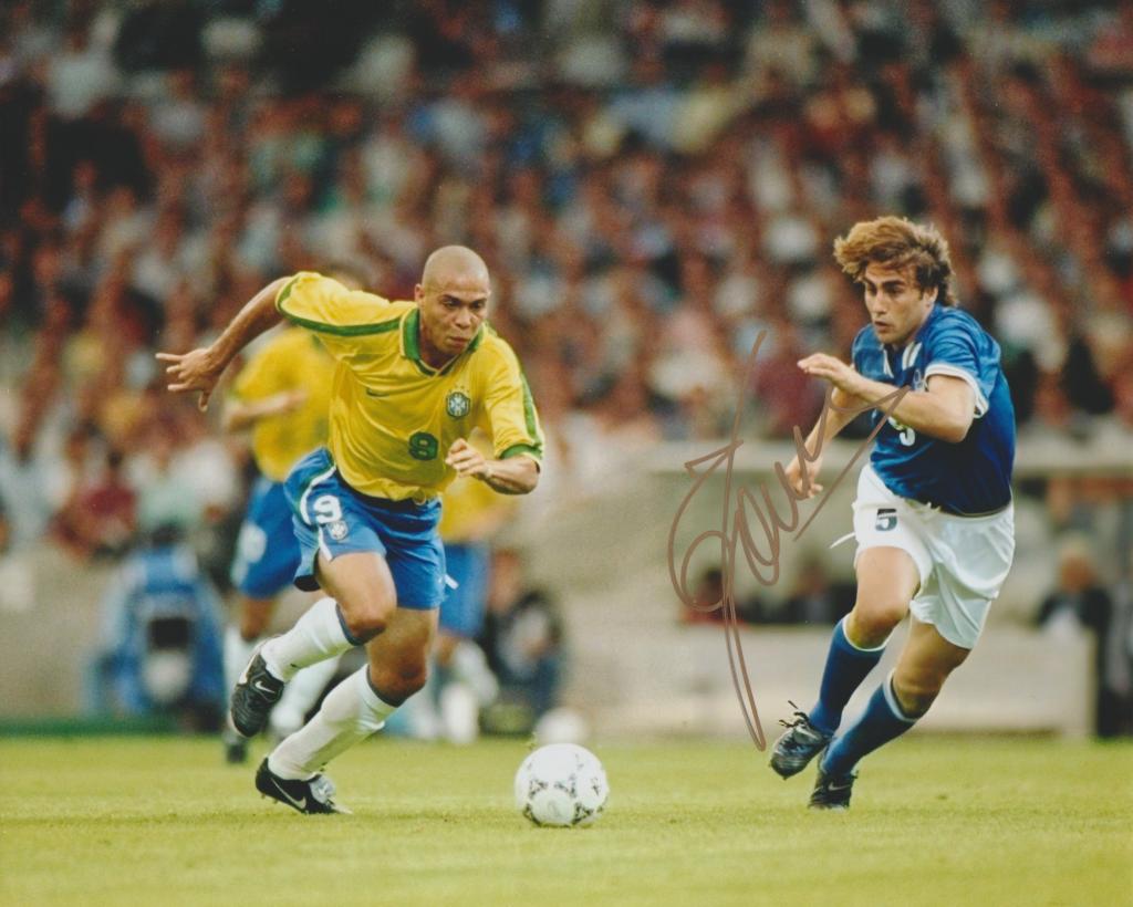 Questa fotografia autografata richiama una sfida internazionale tra Italia e Brasile nel torneo francese del 1997, confronto che vide in campo alcuni dei protagonisti più rappresentativi del calcio mondiale di quella generazione. Un documento di interesse collezionistico legato alla carriera di uno dei difensori più importanti della storia del calcio.