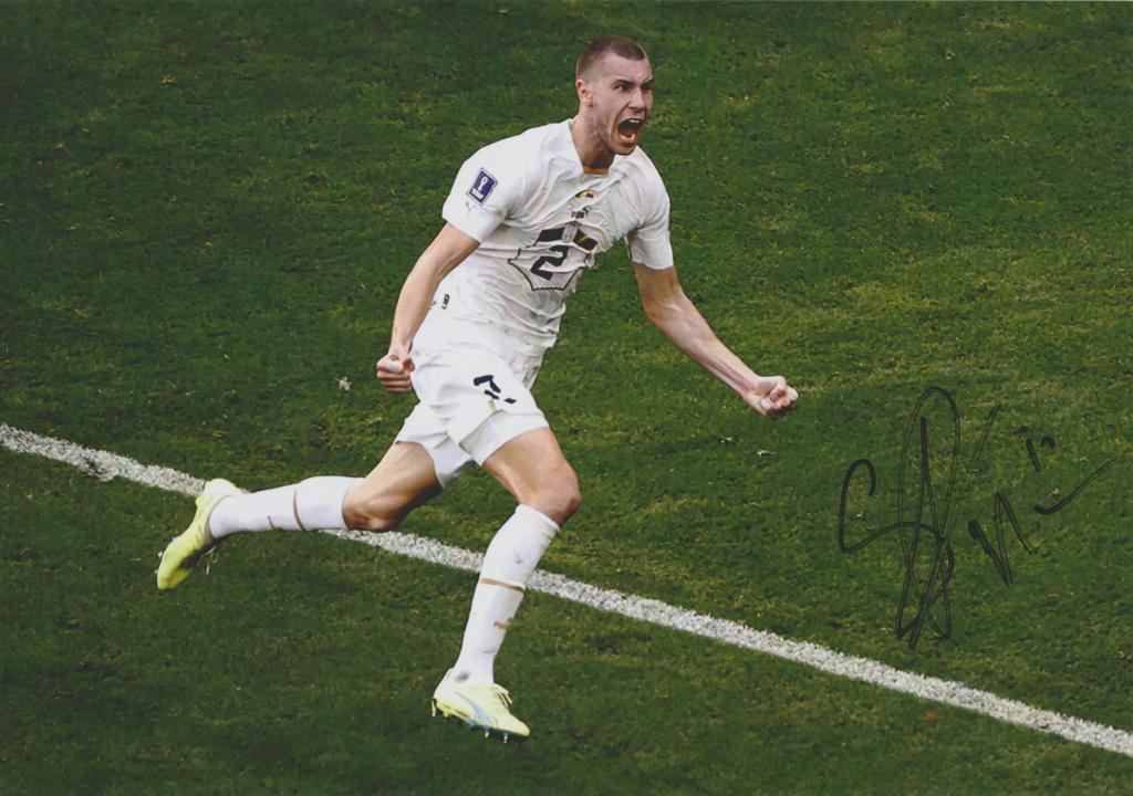 Autografo di Strahinja Pavlovic su fotografia a colori. L’immagine lo ritrae durante un momento di esultanza con la maglia bianca della Nazionale serba, contraddistinta dal numero 2 e dallo stemma federale sul petto, mentre corre sul terreno di gioco dopo un’azione decisiva.