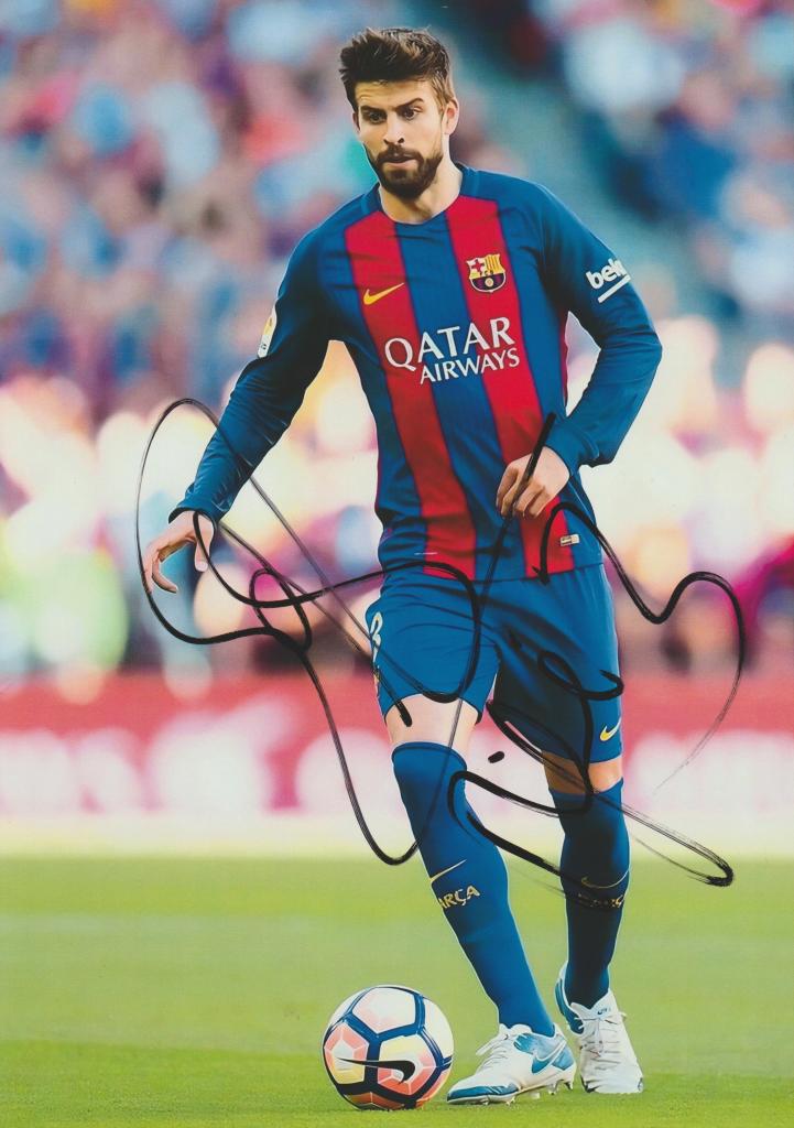 Autografo di Gerard Piqué su fotografia a colori con la maglia del Barcellona Gerard Piqué indossa la divisa blaugrana del FC Barcelona con strisce verticali rosse e blu prodotta da Nike, stemma del club sul petto e sponsor Qatar Airways al centro della maglia, tipica delle stagioni centrali della sua carriera con il club catalano.