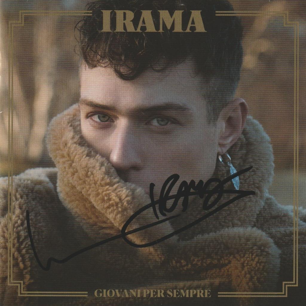 Autografo di Irama su copertina del CD “Giovani per sempre”, firma del cantautore italiano protagonista della scena pop contemporanea.