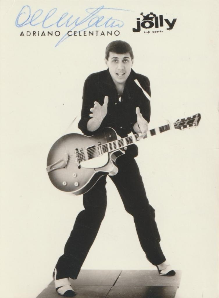 Autografo di Adriano Celentano su fotografia in bianco e nero stampata su cartoncino promozionale. Il supporto appartiene alla serie pubblicitaria della Jolly Hi-Fi Records (etichetta Saar) e raffigura il giovane artista con la chitarra elettrica in una posa dinamica tipica delle immagini promozionali dell’epoca, con i loghi ufficiali della casa discografica visibili nella parte superiore.