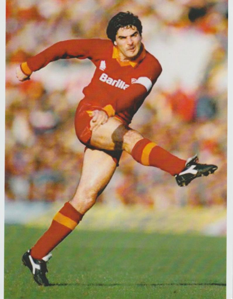 Agostino Di Bartolomei, nato a Roma nel 1955 e scomparso nel 1994, è stato uno dei centrocampisti più rappresentativi del calcio italiano. Capitano e simbolo della AS Roma, ha guidato la squadra alla conquista dello Scudetto 1982-83 e alla finale di Coppa dei Campioni del 1984. Giocatore dotato di grande visione di gioco e precisione nei calci da fermo, ha lasciato un segno indelebile nella storia del club giallorosso.