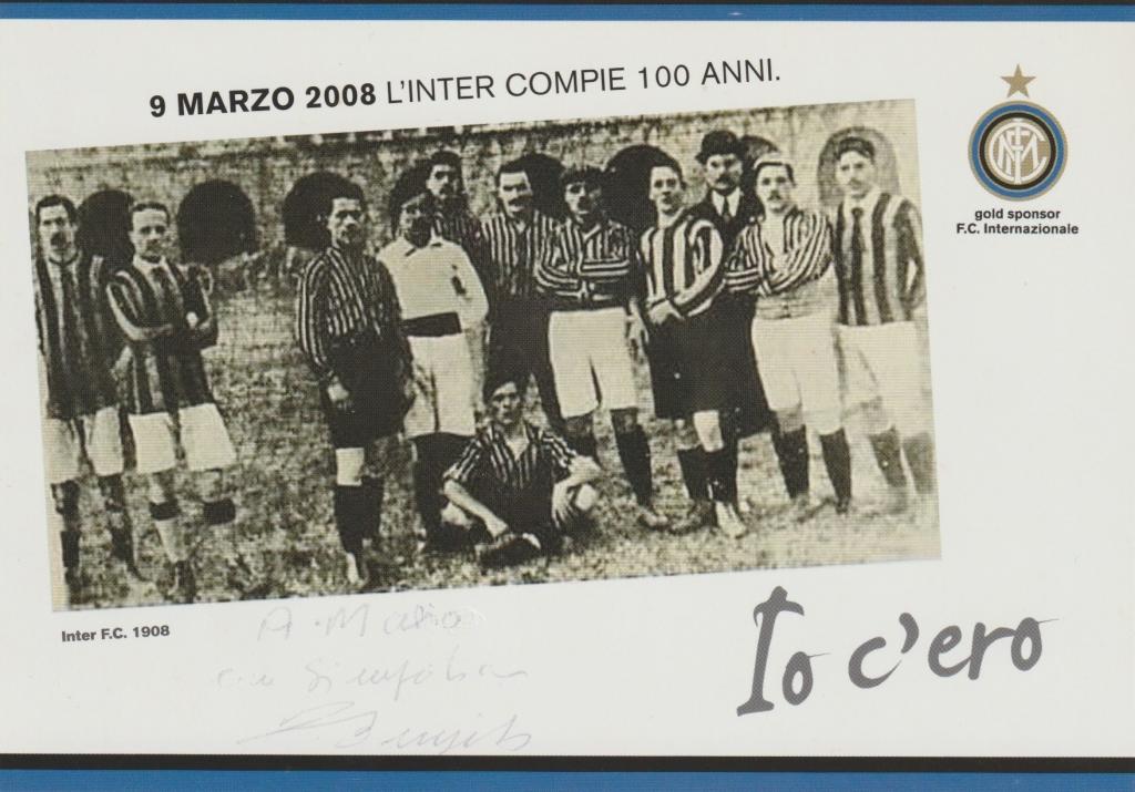 Autografo di Tarcisio Burgnich su cartolina celebrativa Inter 1908–2008. Firma a penna nella parte inferiore.