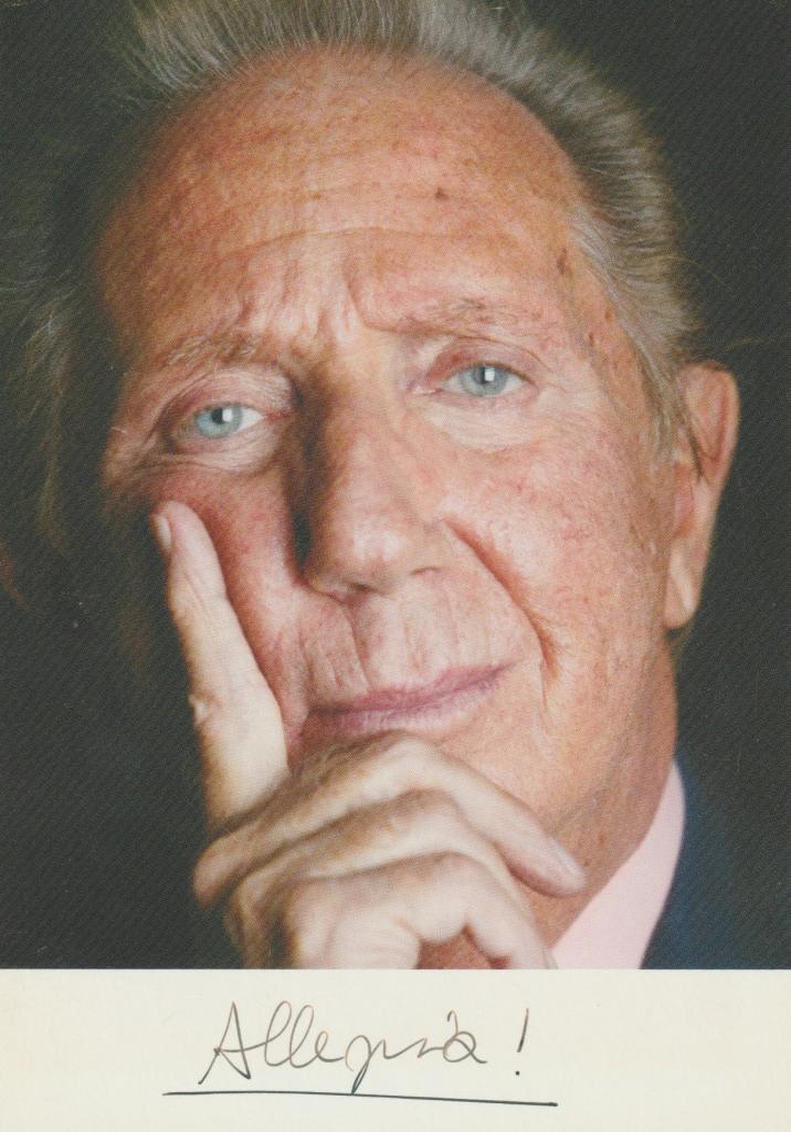 Fotografia a colori con Mike Bongiorno in primo piano con il celebre motto che lo ha accompagnato nella sua intera carriera televisiva “Allegria!".