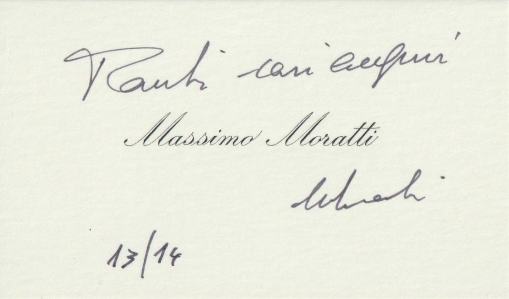 Il supporto presenta il nome “Massimo Moratti” stampato al centro, su carta chiara, con spazio superiore utilizzato per la dedica manoscritta.