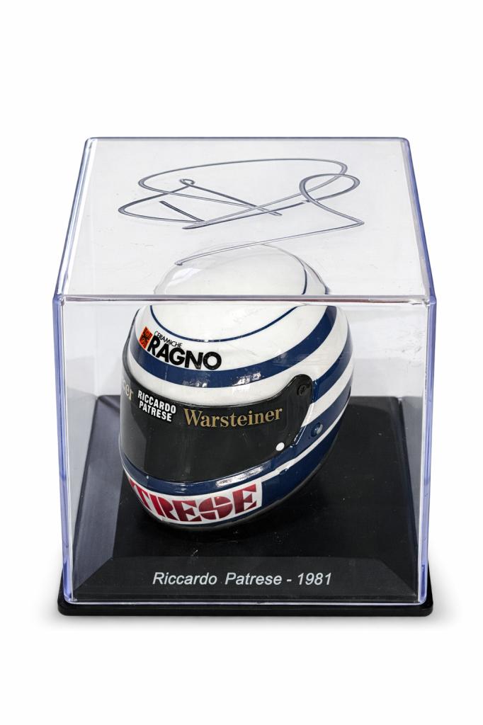 Autografo di Riccardo Patrese su casco in miniatura da Formula 1, riproduzione del modello utilizzato dal pilota con la scuderia Arrows nei primi anni Ottanta, presentato in teca espositiva con base identificativa “Riccardo Patrese – 1981”.