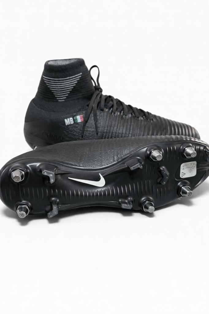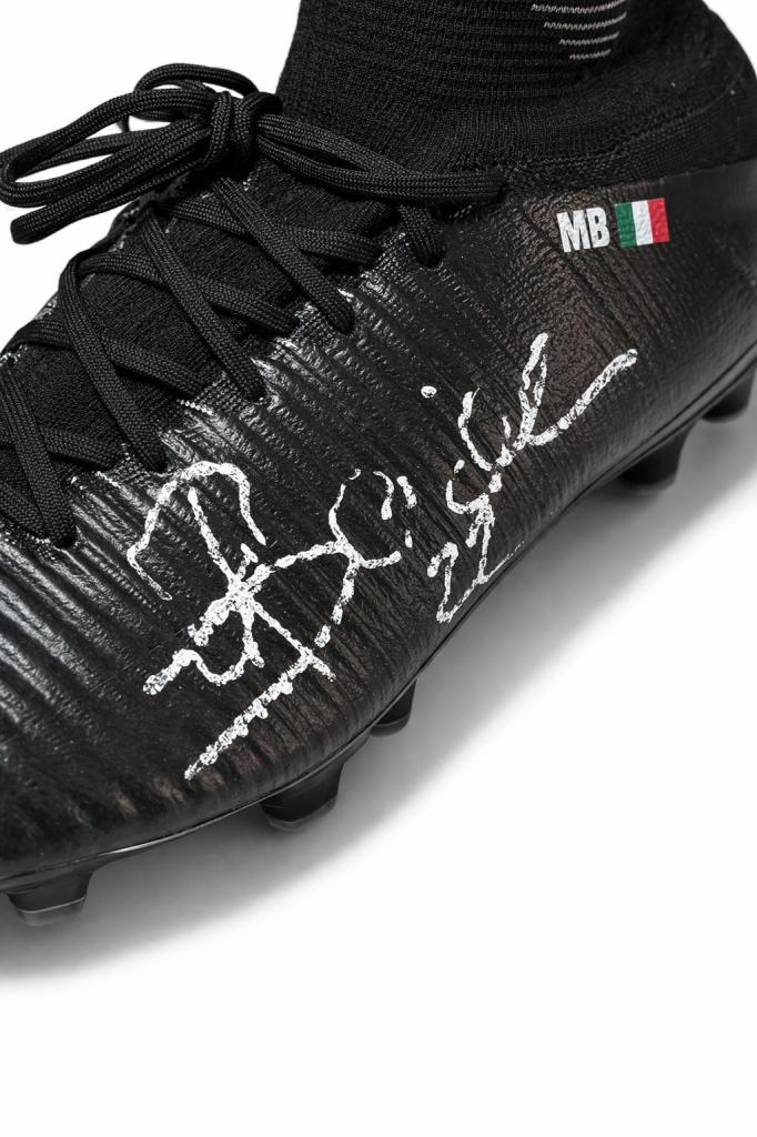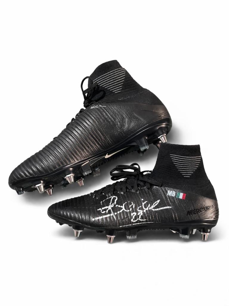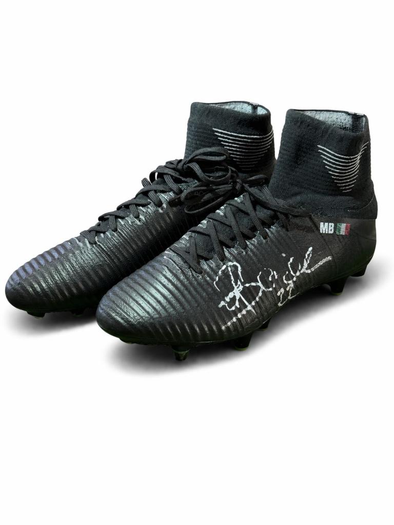 Paio di scarpe Nike Mercurial in versione high-cut, realizzate per uso professionale, caratterizzate da costruzione “Made in Bosnia”, tipica delle forniture destinate esclusivamente agli atleti e non alla distribuzione retail. Le scarpe presentano personalizzazione “MB” con bandiera italiana sul tallone e firma autografa apposta a pennarello bianco sulla tomaia.