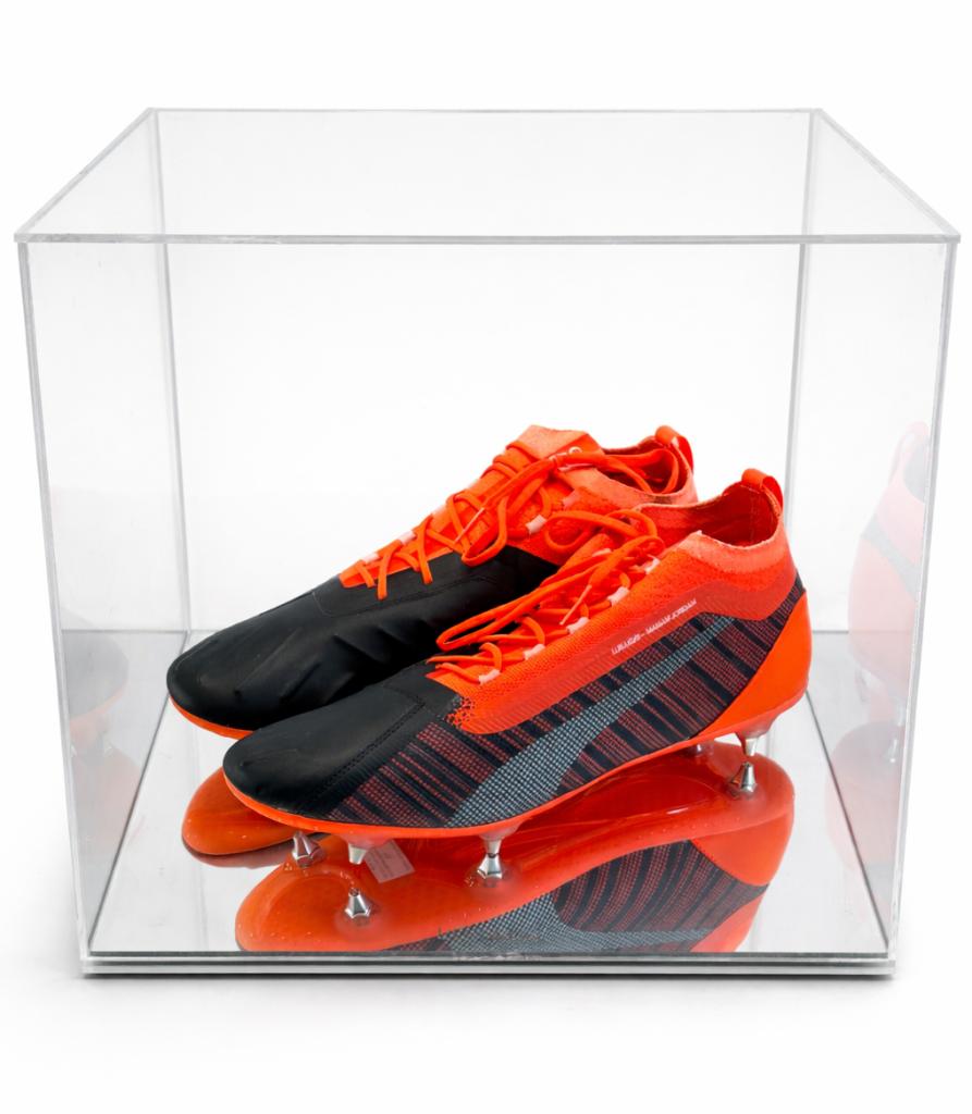 Paio di scarpe Puma Ultra realizzate per Romelu Lukaku, caratterizzate da colorazione arancio/nero ad alta visibilità e struttura ultraleggera pensata per velocità e accelerazione. Il modello presenta configurazione con tacchetti misti (FG/SG) e suola ad alte prestazioni.