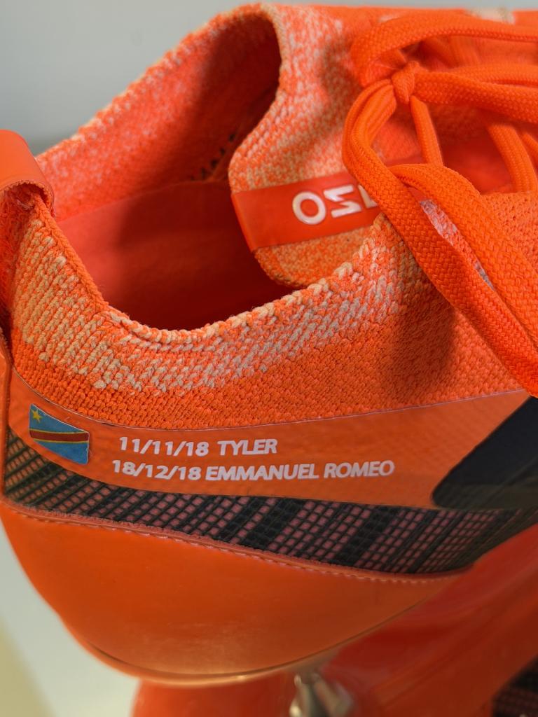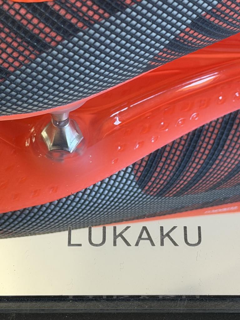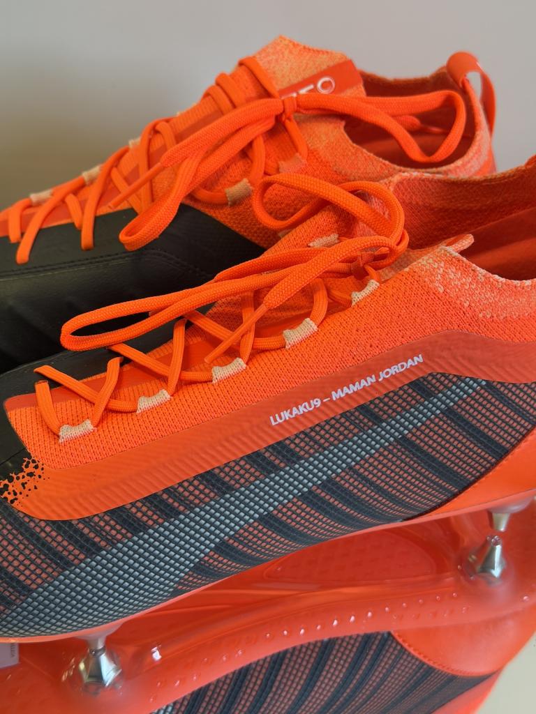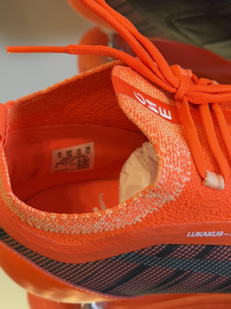 Sulla tomaia è presente la personalizzazione “LUKAKU 9 – MAMAN JORDAN”, dettaglio tipico delle calzature destinate all’atleta, che richiama elementi personali e familiari del calciatore. La presenza del nome stampato sul supporto espositivo e le specifiche tecniche indicano un utilizzo professionale o preparazione diretta per l’atleta.