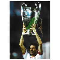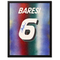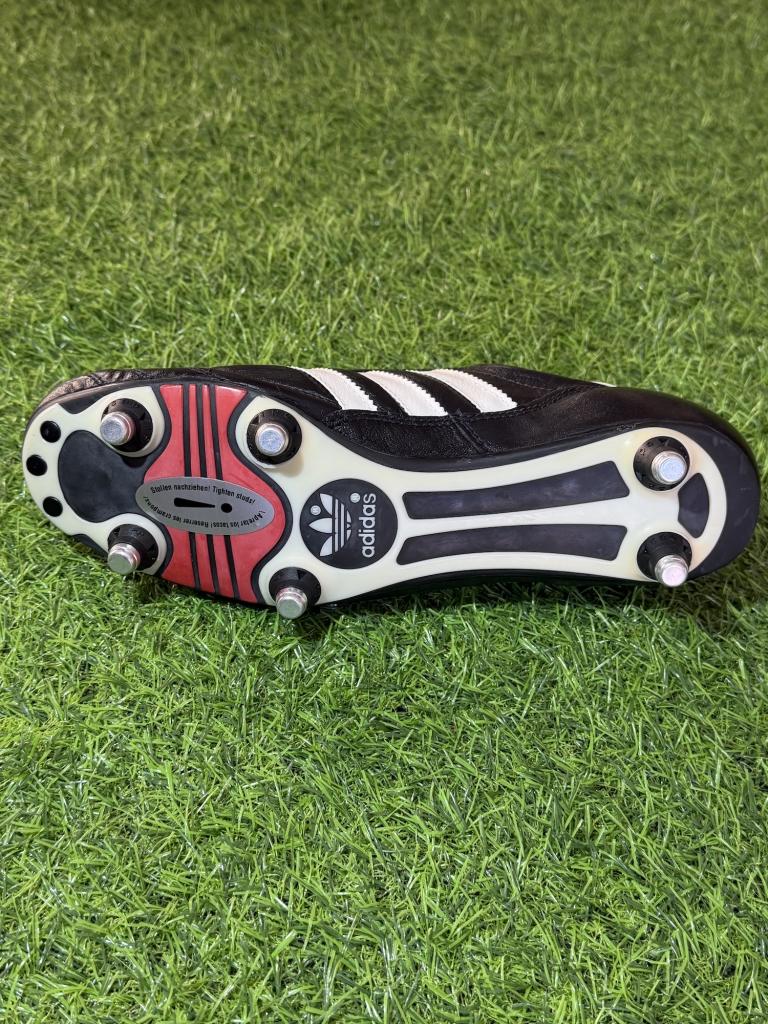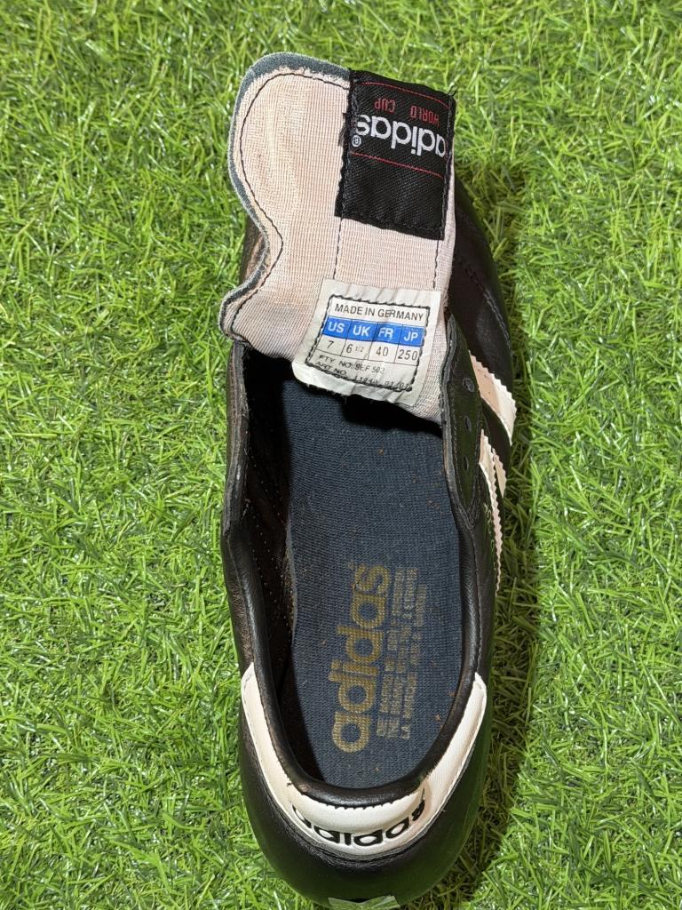 Autografo di Franco Baresi su scarpa da calcio Adidas World Cup, modello iconico in pelle nera con tre strisce bianche e suola con tacchetti in metallo. La firma è apposta lateralmente sul tallone con pennarello dorato, ben visibile e in ottimo contrasto con la tomaia. Scarpa singola in condizioni d’uso, caratterizzata da costruzione classica e qualità artigianale, simbolo di una delle calzature più rappresentative nella storia del calcio.