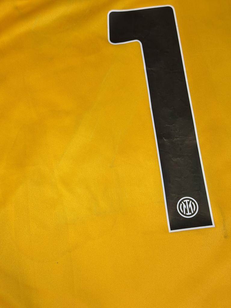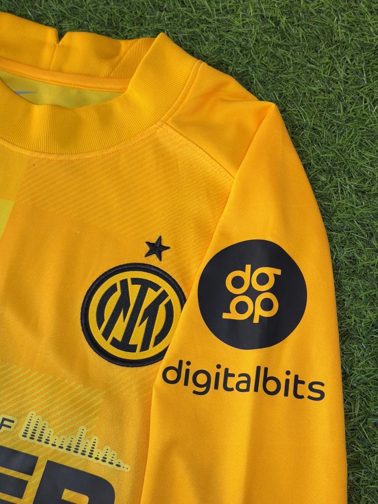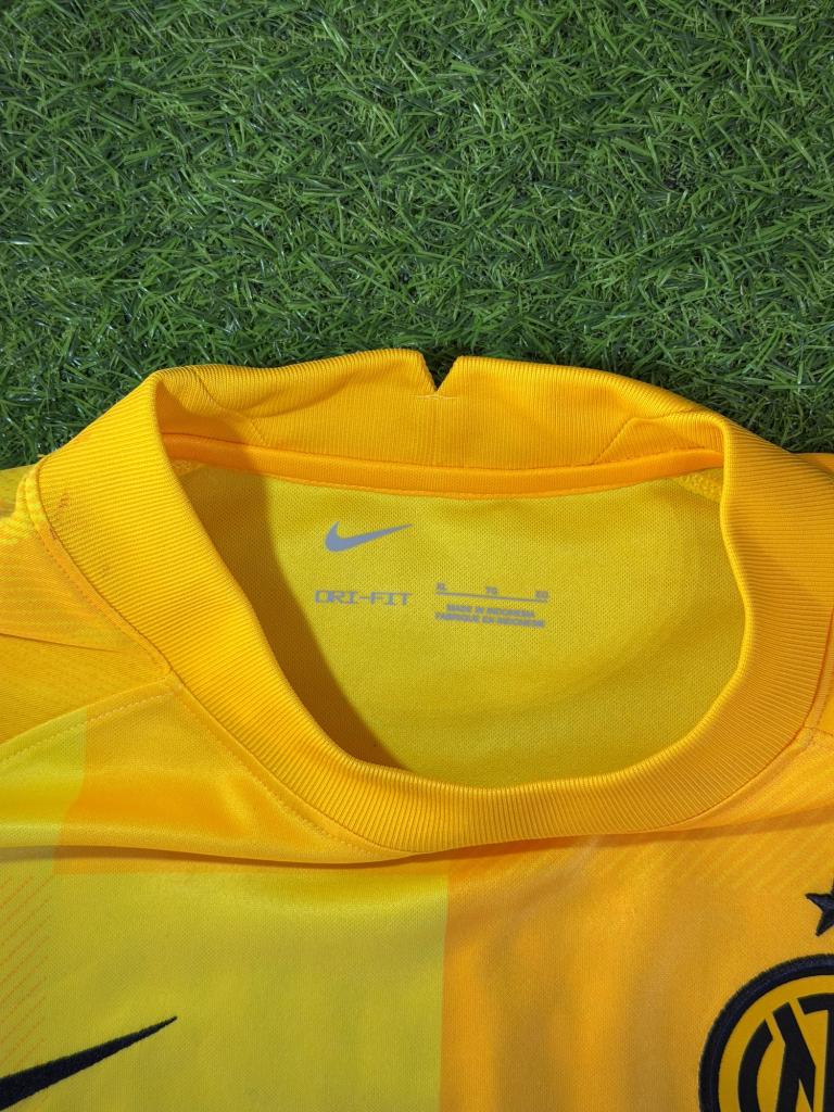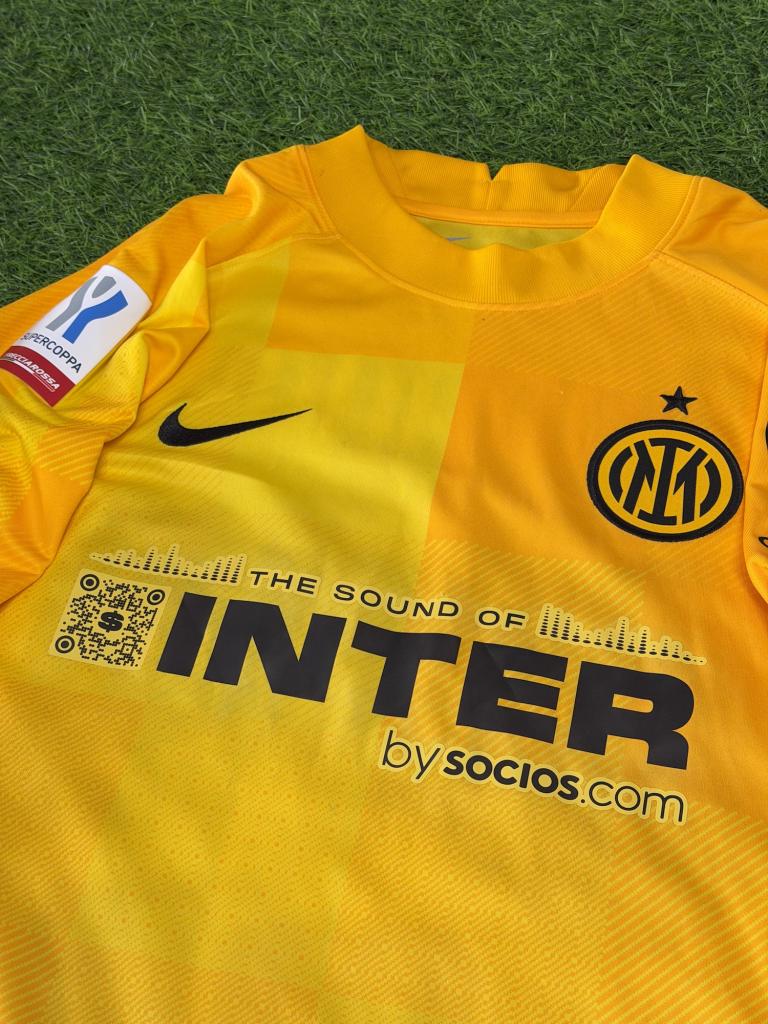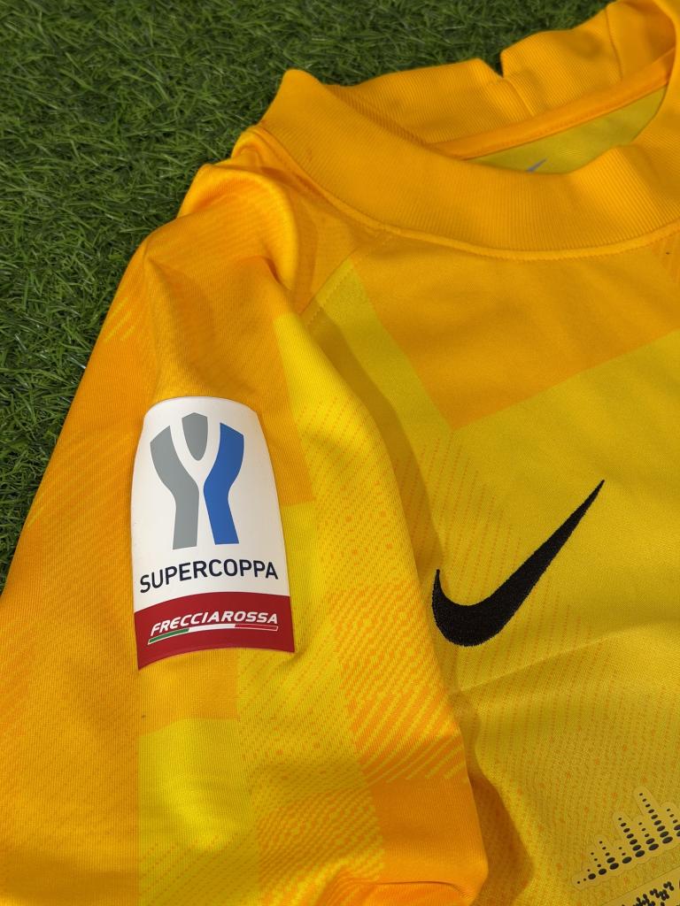 Realizzata da Nike nella versione portiere, si presenta in una vivace tonalità gialla con inserti grafici tono su tono che creano un effetto dinamico sulla superficie. Il logo Nike è applicato in nero sul petto, accompagnato dallo stemma dell’Inter con stella. Lo sponsor commerciale è “Inter by socios.com” con grafica “The Sound of Inter”, mentre sulla manica è presente la patch Supercoppa Frecciarossa e lo sponsor DigitalBits.