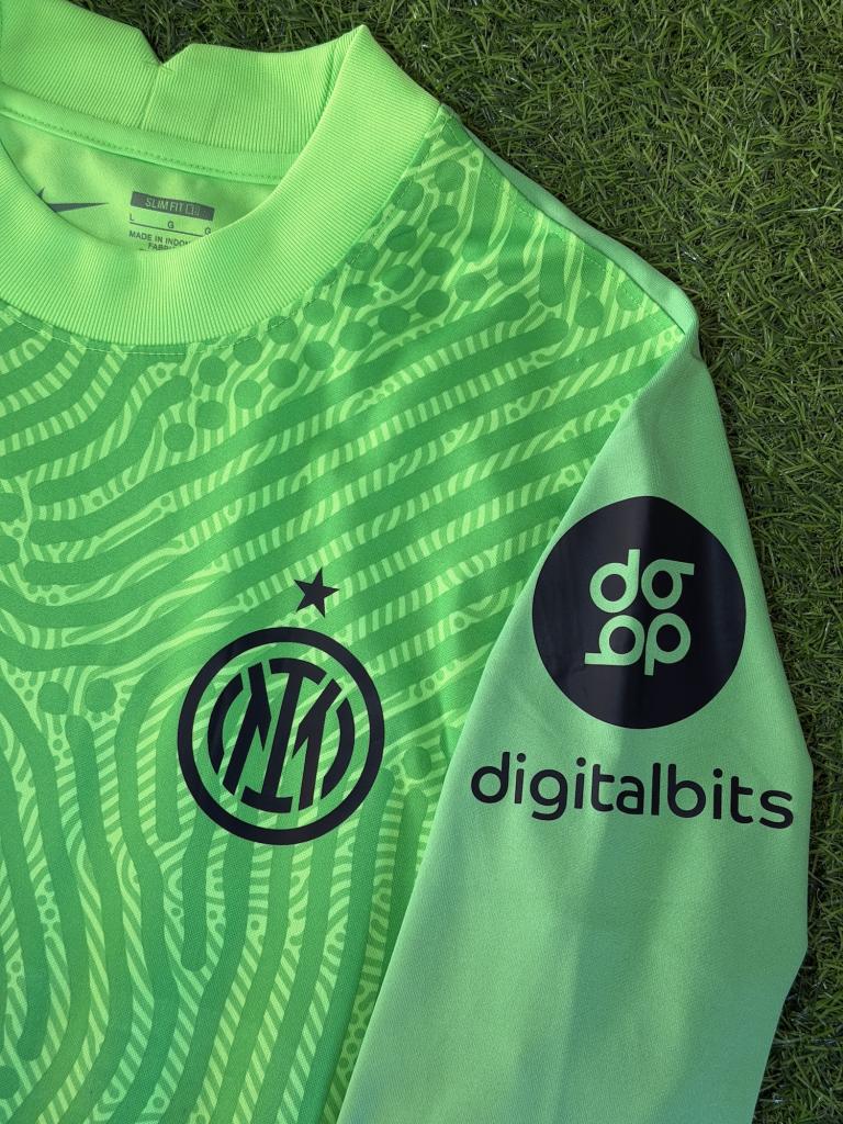 Realizzata da Nike nella versione portiere, si distingue per la colorazione verde acceso con pattern grafico ondulato tono su tono che attraversa l’intera superficie. Il logo Nike è applicato sul petto insieme allo stemma dell’Inter con stella. Sulla manica è presente lo sponsor DigitalBits, mentre il design generale richiama uno stile moderno e tecnico.