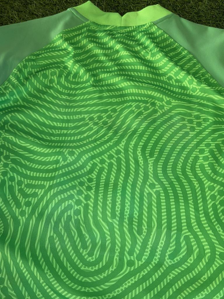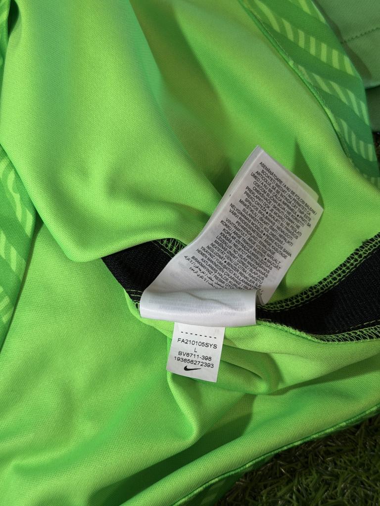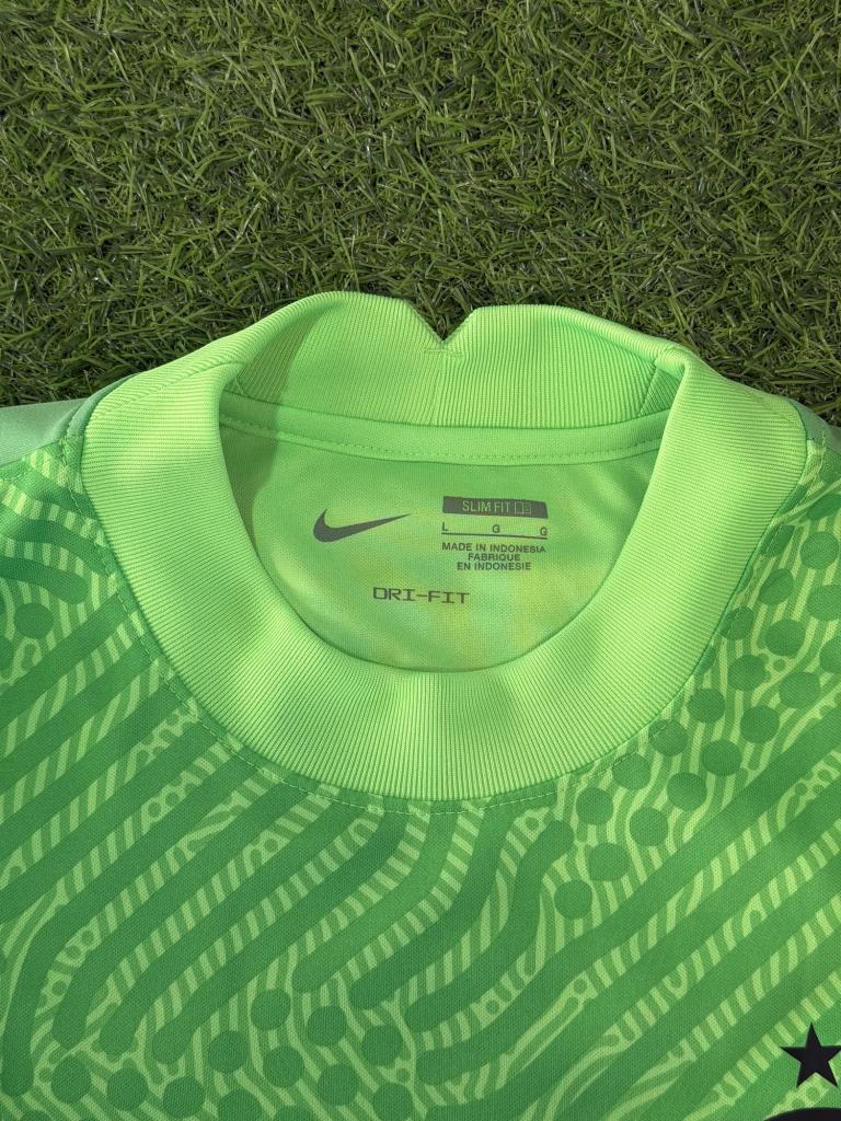 Il modello è a manica lunga con vestibilità slim fit, caratterizzato da un colletto girocollo elasticizzato e costruzione pensata per il ruolo del portiere. Il tessuto è in poliestere tecnico Dri-FIT, leggero e traspirante, studiato per favorire comfort, elasticità e gestione della sudorazione durante l’attività.
