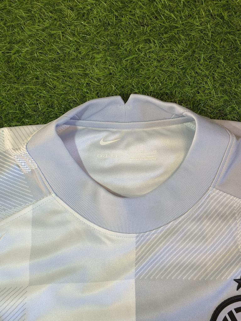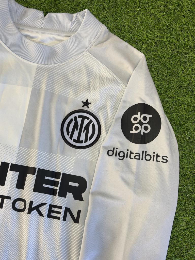 Prodotta da Nike, presenta swoosh nero sul petto, stemma Inter con stella e sponsor principale $INTER Fan Token. Sulla manica è presente lo sponsor DigitalBits. Il design minimal ma ricercato è arricchito da un pattern geometrico che attraversa tutta la maglia, mantenendo uno stile tecnico e contemporaneo.