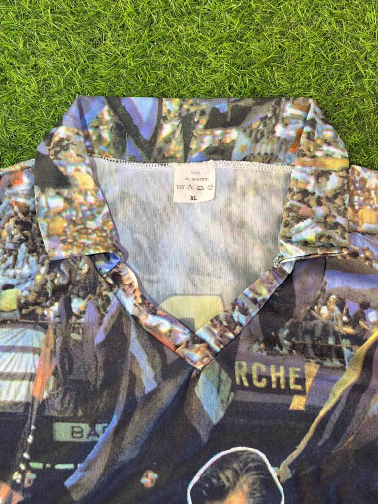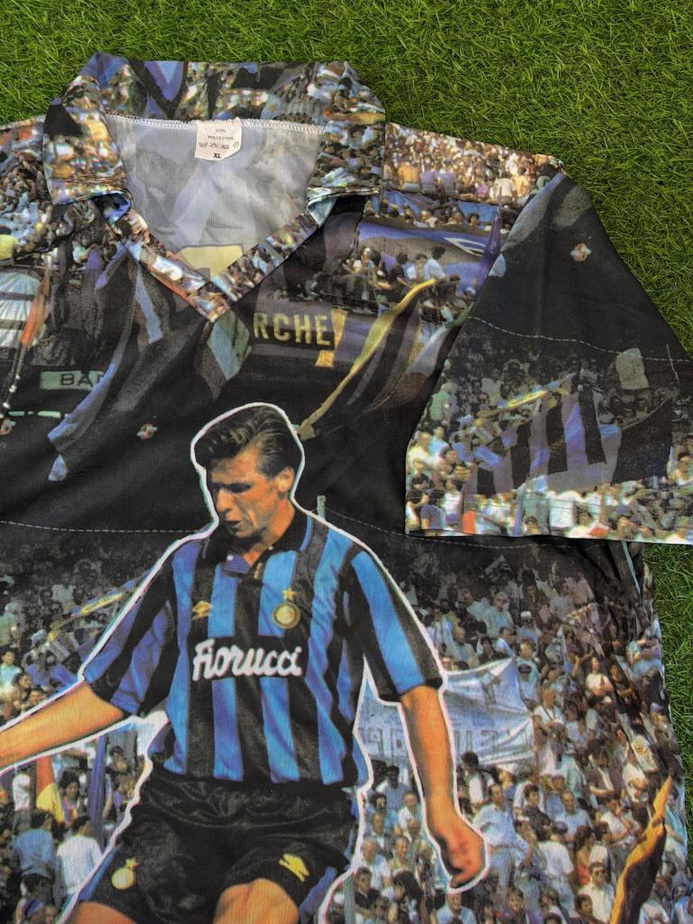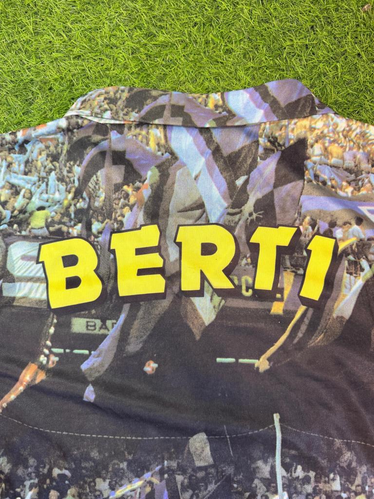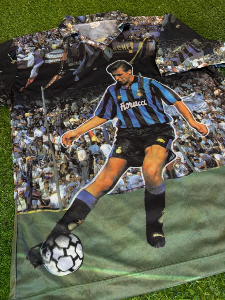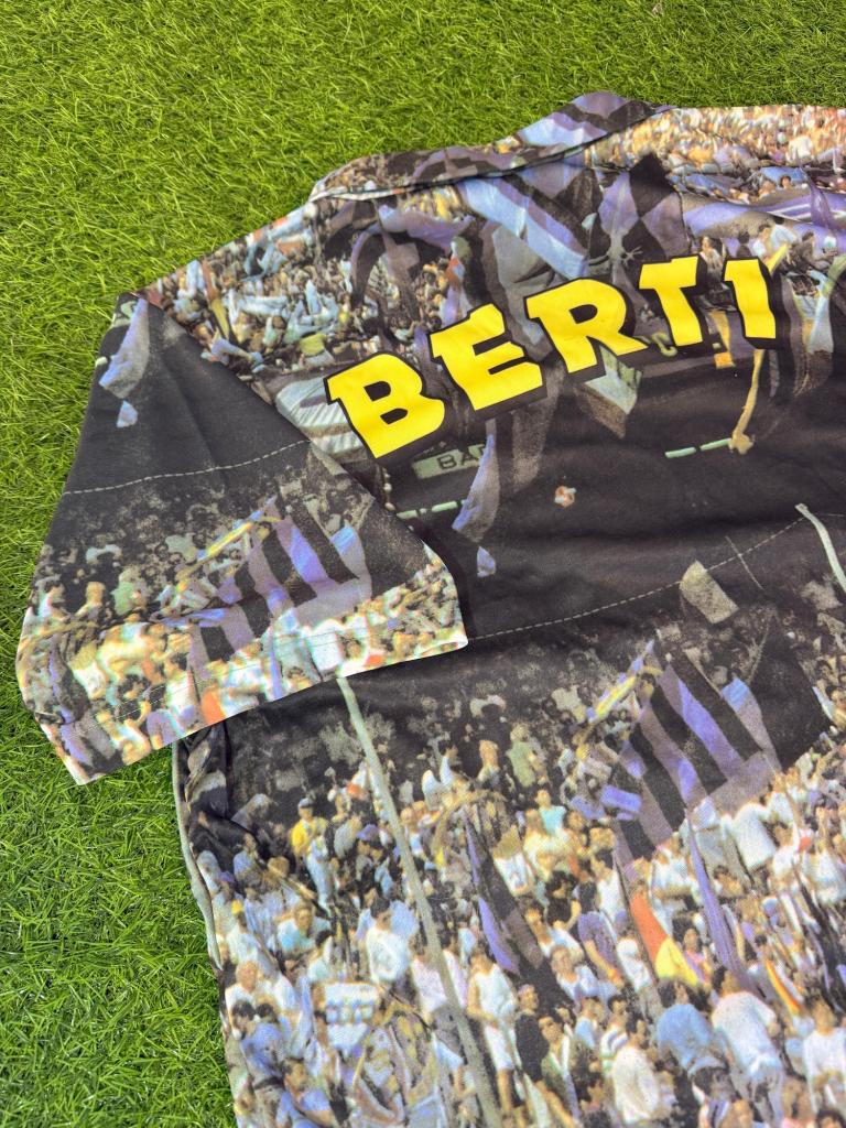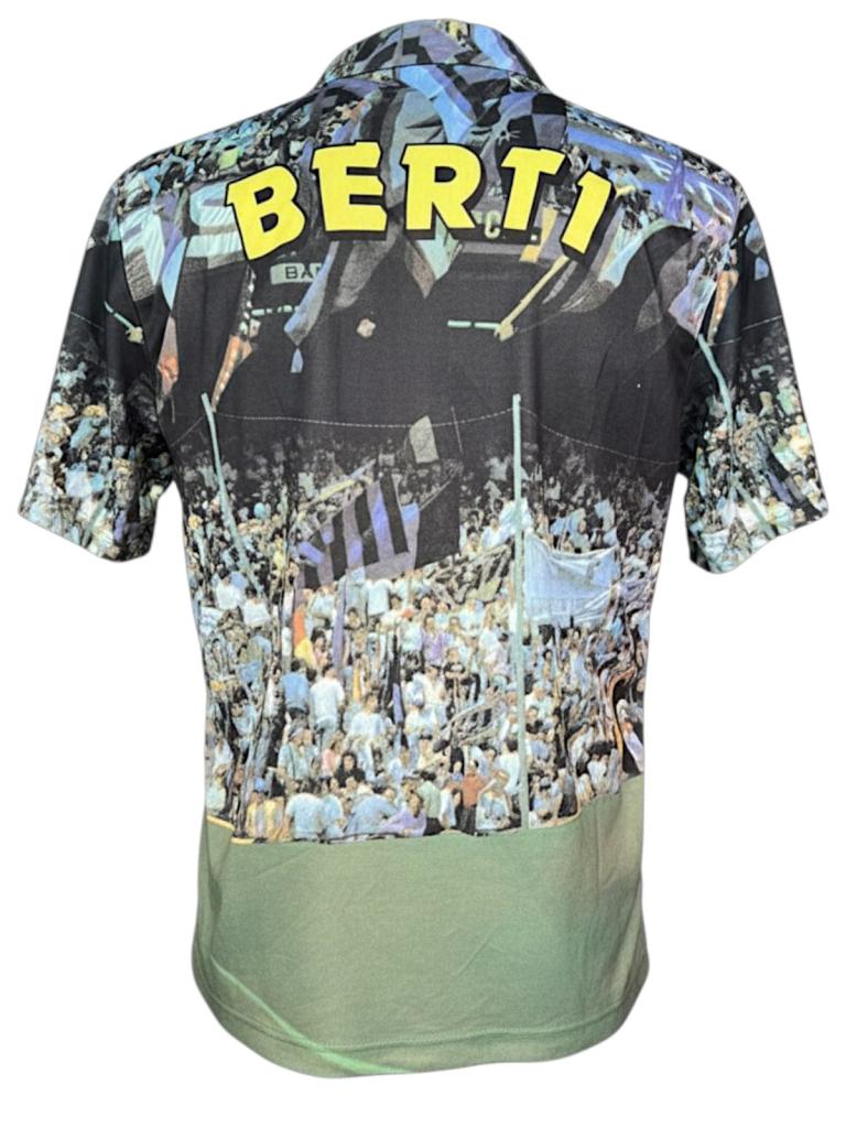 Realizzata in poliestere, presenta una stampa all-over con immagine di Berti in azione con la storica maglia nerazzurra sponsor Fiorucci, immerso in un contesto di tifosi e bandiere che richiamano l’atmosfera degli anni ’90. Sul retro spicca la scritta “BERTI” in grande formato, integrata nella grafica. Il design è completato da colletto a polo e maniche corte, per uno stile casual e celebrativo.