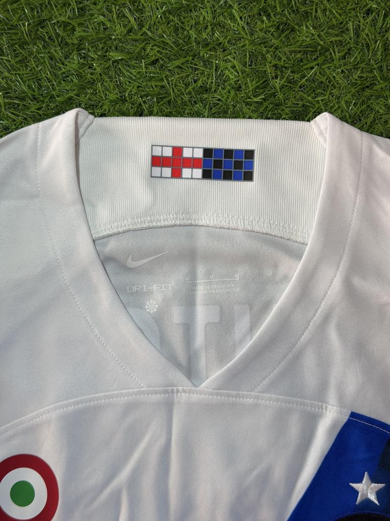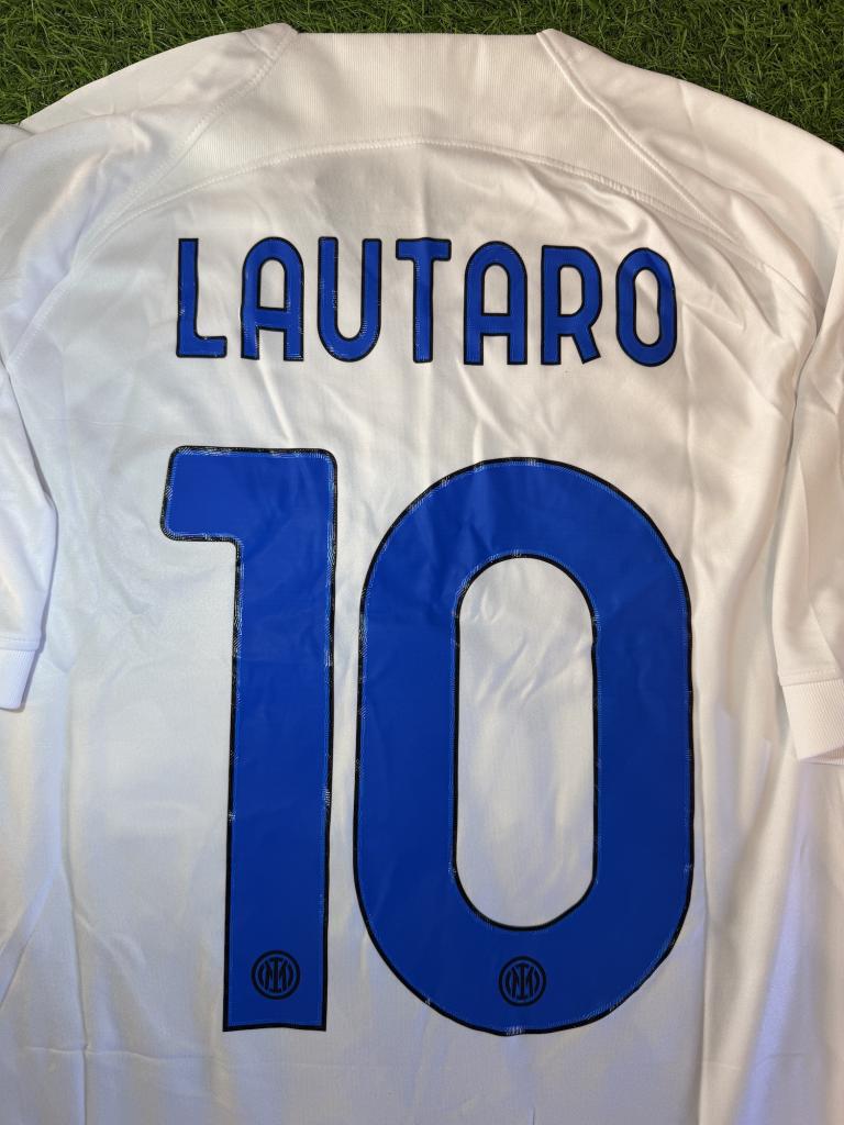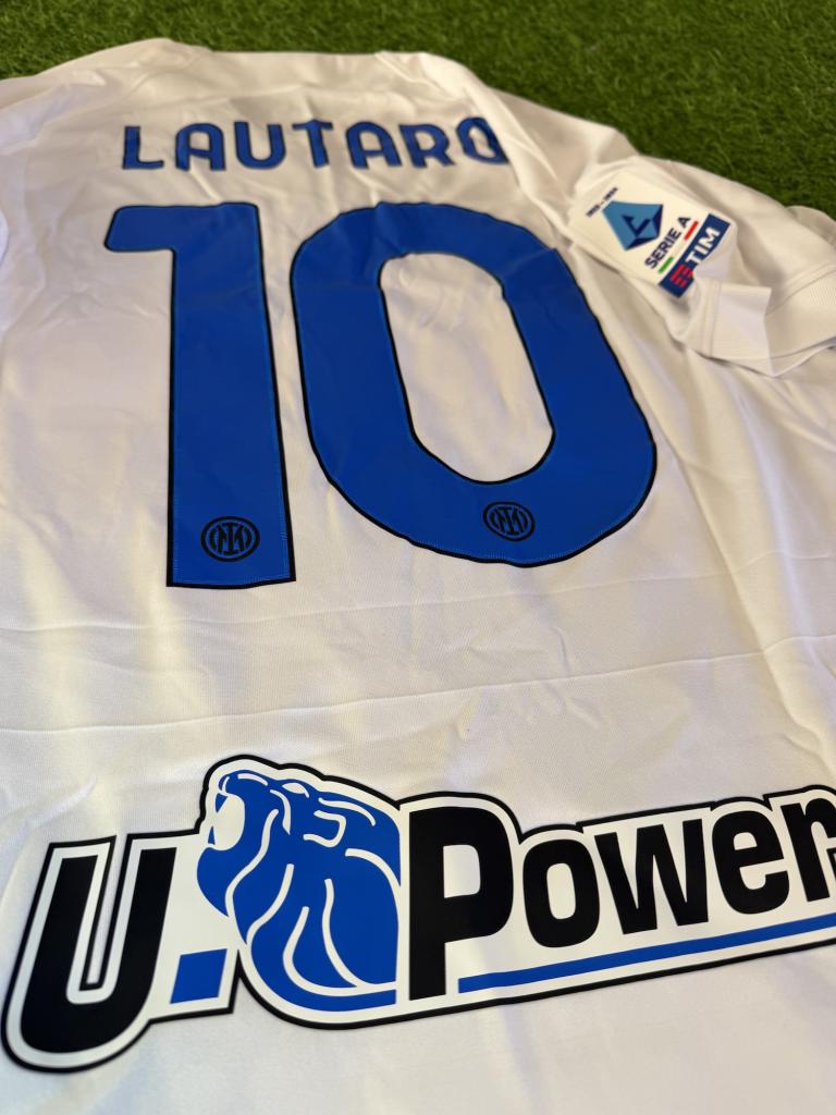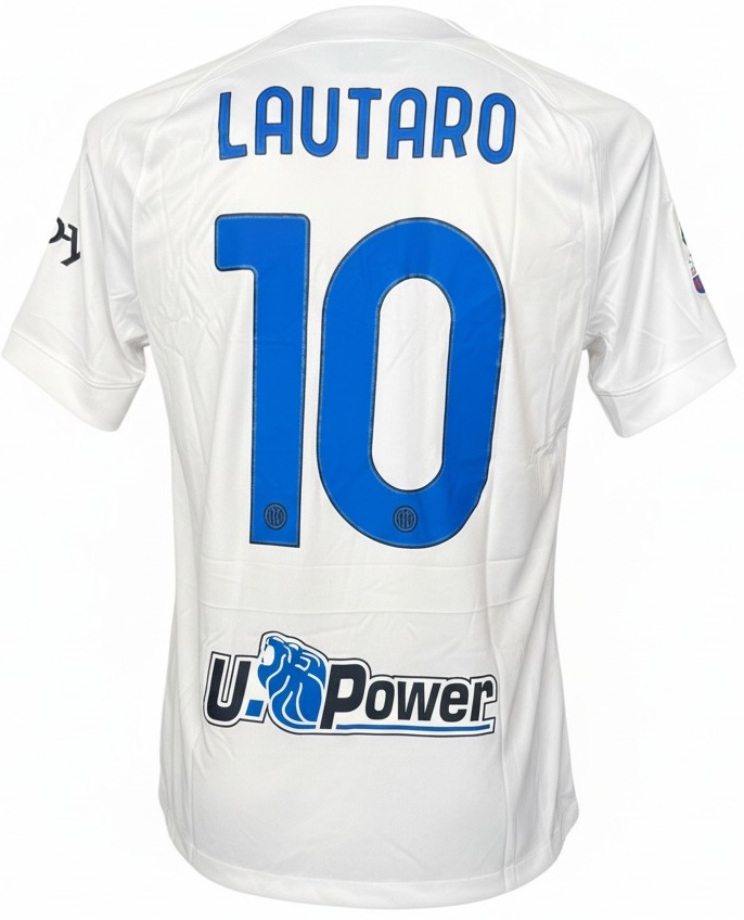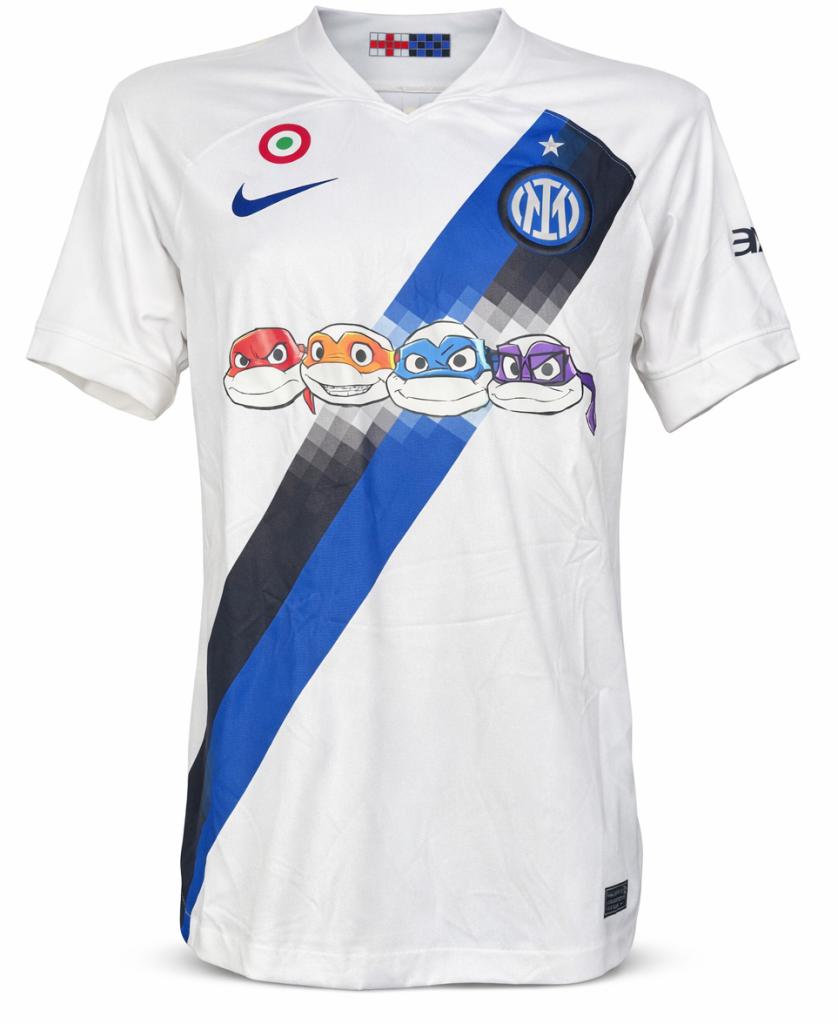 Modello da trasferta con base bianca e iconica banda diagonale nero-azzurra effetto pixel. Presenta sponsor tecnico Nike, sponsor commerciale speciale con le Tartarughe Ninja al posto di Paramount+, patch Serie A TIM 2023/2024 sulla manica, sponsor eBay e U-Power sul retro. Sul retro sono applicati nome Lautaro e numero 10 in blu. Tessuto Dri-FIT leggero e traspirante con vestibilità regolare, pensato per comfort e utilizzo quotidiano.