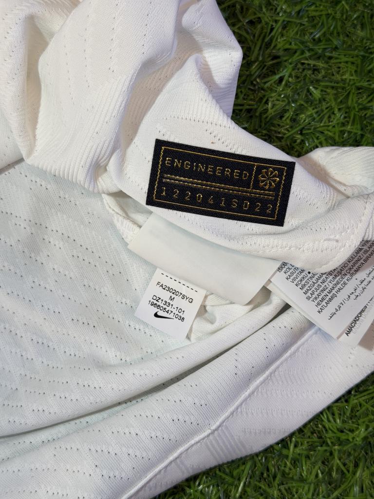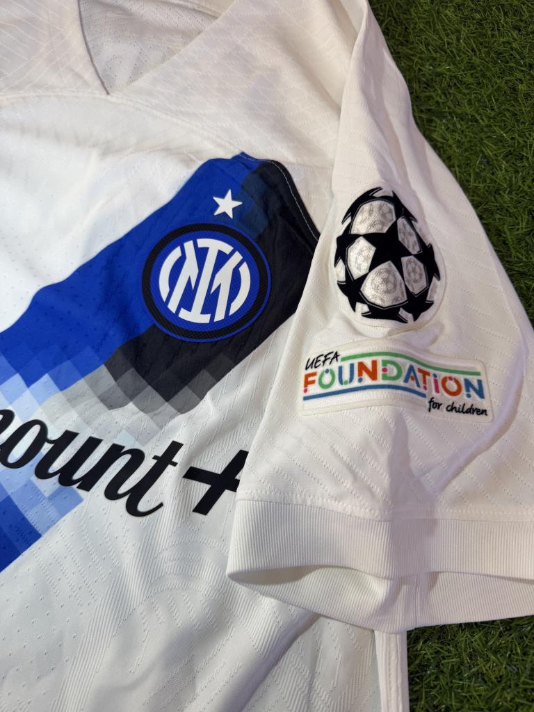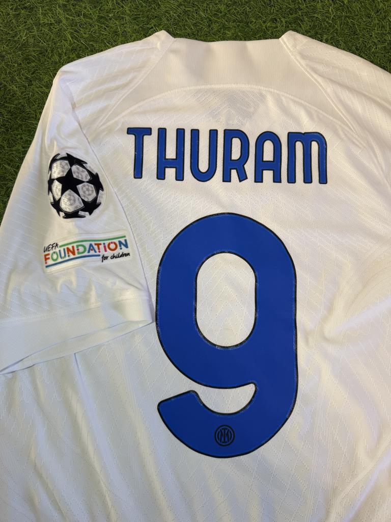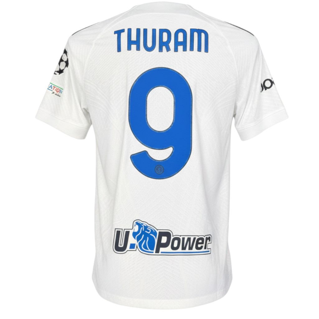 Maglia away dell’Inter versione Authentic stagione 2023/2024 con personalizzazione Thuram 9 e completa con patch di Champions League.