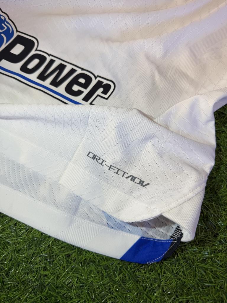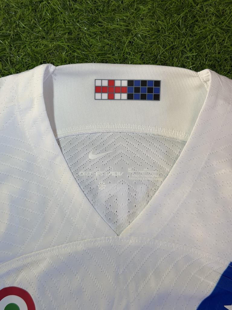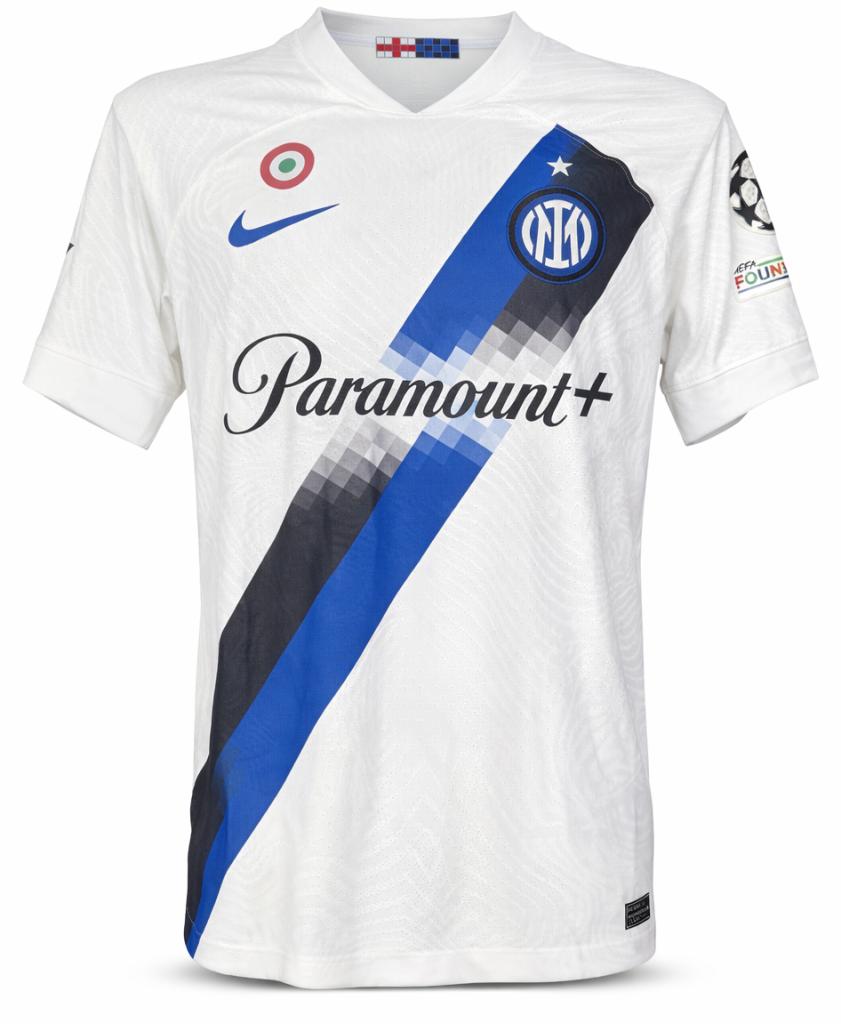 Modello da trasferta con base bianca e iconica banda diagonale nero-azzurra effetto pixel. Presenta sponsor tecnico Nike, sponsor commerciale Paramount+, patch UEFA Champions League e UEFA Foundation for Children sulla manica, oltre allo sponsor U-Power sul retro. Sul retro sono applicati nome Thuram e numero 9 in blu.