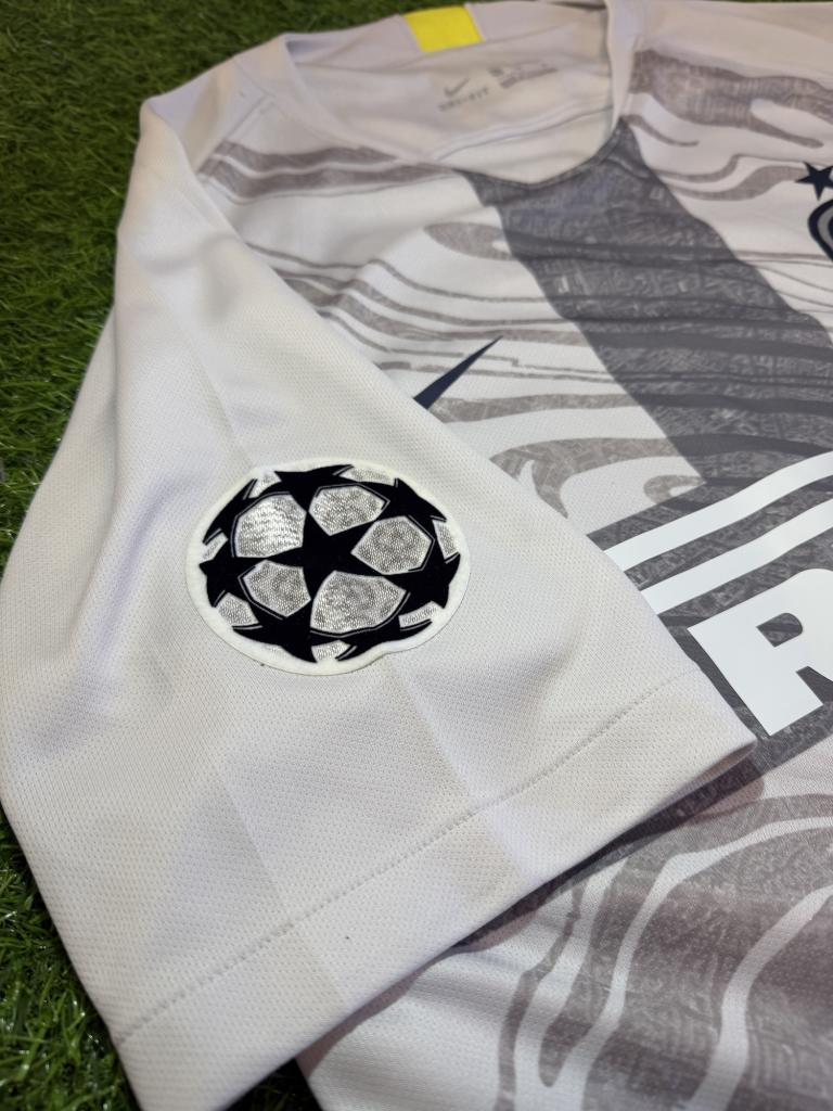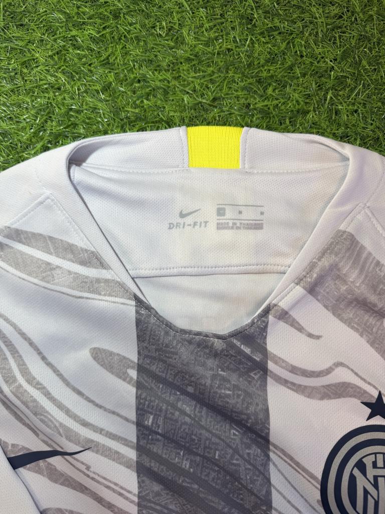Terza divisa caratterizzata da base bianca con grafica frontale grigio antracite effetto marmorizzato e croce centrale, con dettagli in blu e inserto giallo sul retro del colletto. Presenta sponsor tecnico Nike e sponsor commerciale Pirelli, oltre alle patch UEFA Champions League e UEFA Respect sulle maniche. Sul retro sono applicati nome Vecino e numero 8 in blu. Tessuto Dri-FIT con costruzione leggera e confortevole, pensato per uso quotidiano e collezione.