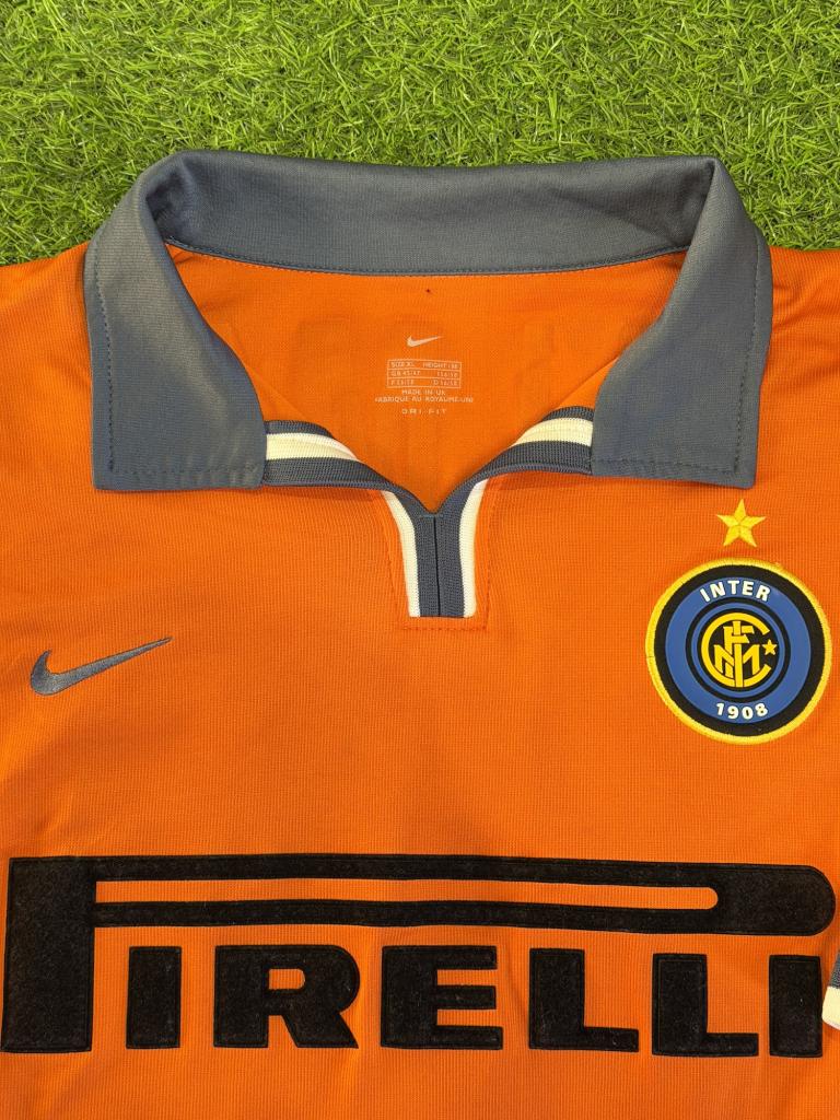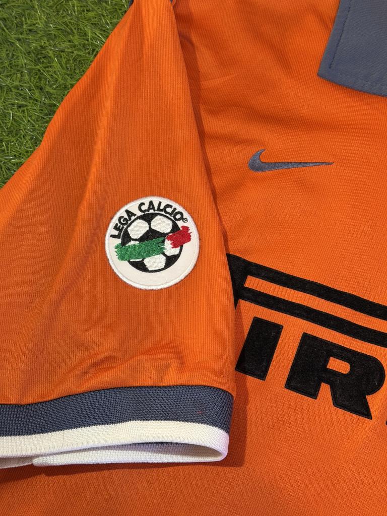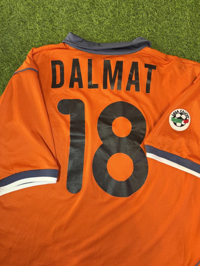 Terza divisa iconica in arancione acceso con dettagli grigio scuro su colletto e bordi manica, tipico design Nike dei primi anni 2000. Presenta sponsor tecnico Nike e sponsor commerciale Pirelli in velluto, patch Lega Calcio cucita sulla manica e crest Inter con stella ricamato. Sul retro sono presenti nome Dalmat e numero 18 in materiale leggero da gara. Struttura Dri-FIT con costruzione più tecnica e aderente rispetto alle versioni commerciali.