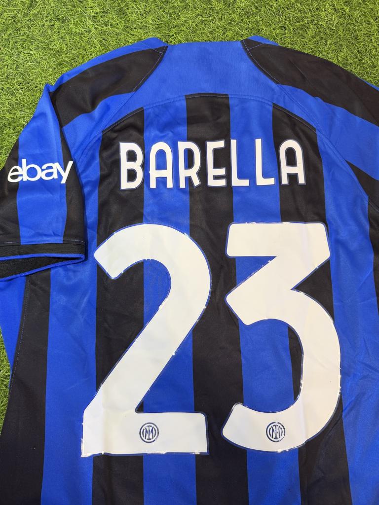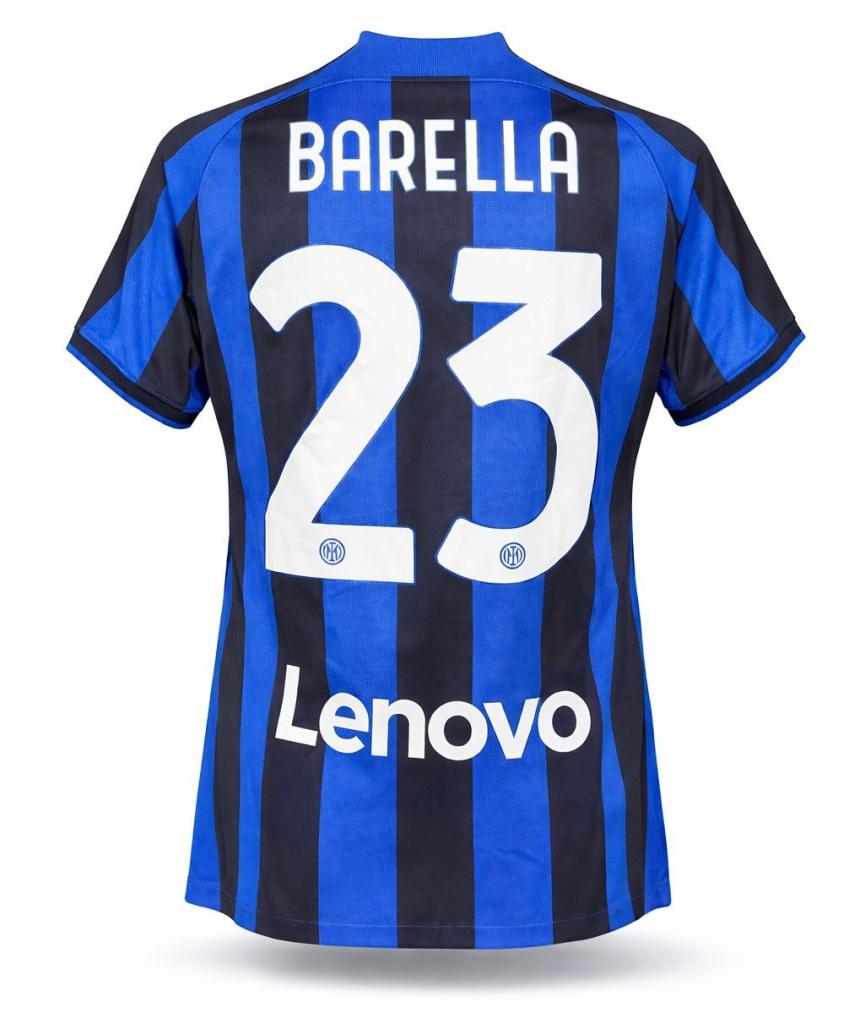 Maglia home dell’Inter della stagione 2022/2023 con personalizzazione Barella 23. Prodotta da Nike in versione store.