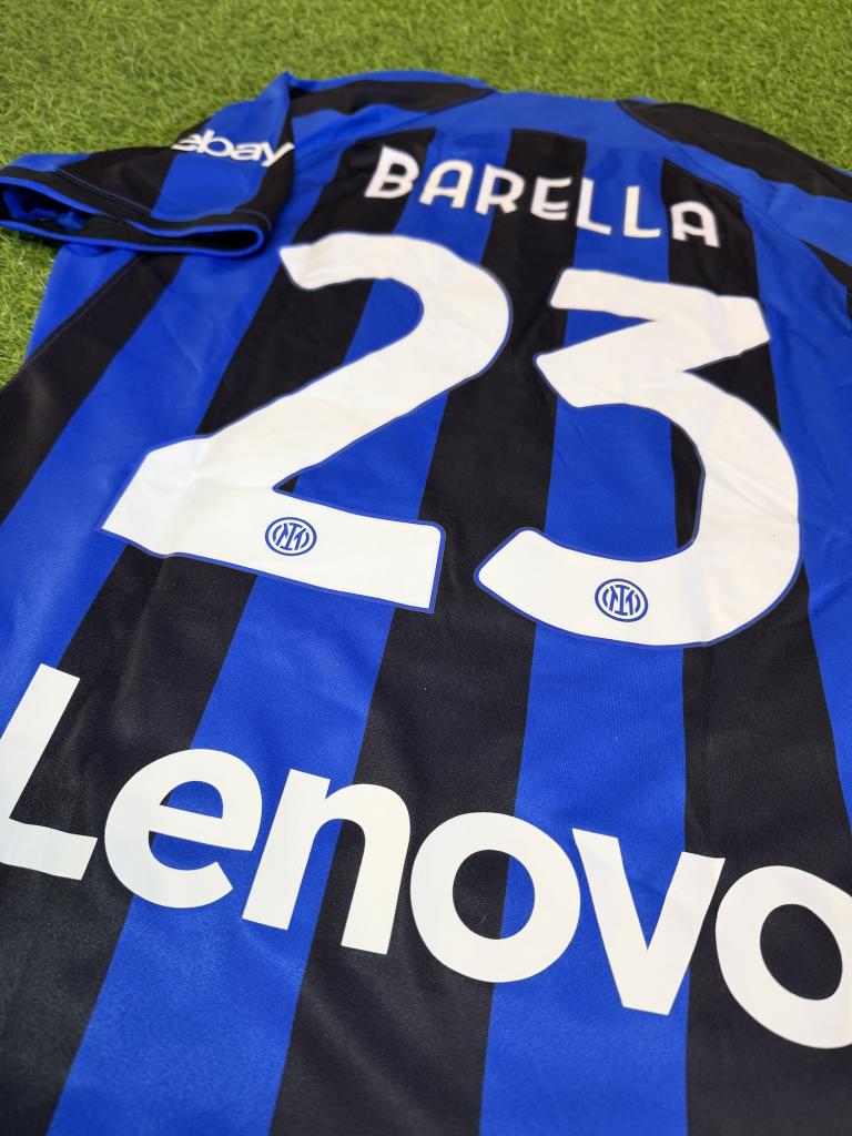 Maglia home dell’Inter stagione 2022/2023 con personalizzazione Barella 23, caratterizzata dal classico design nerazzurro e sponsor ufficiali.