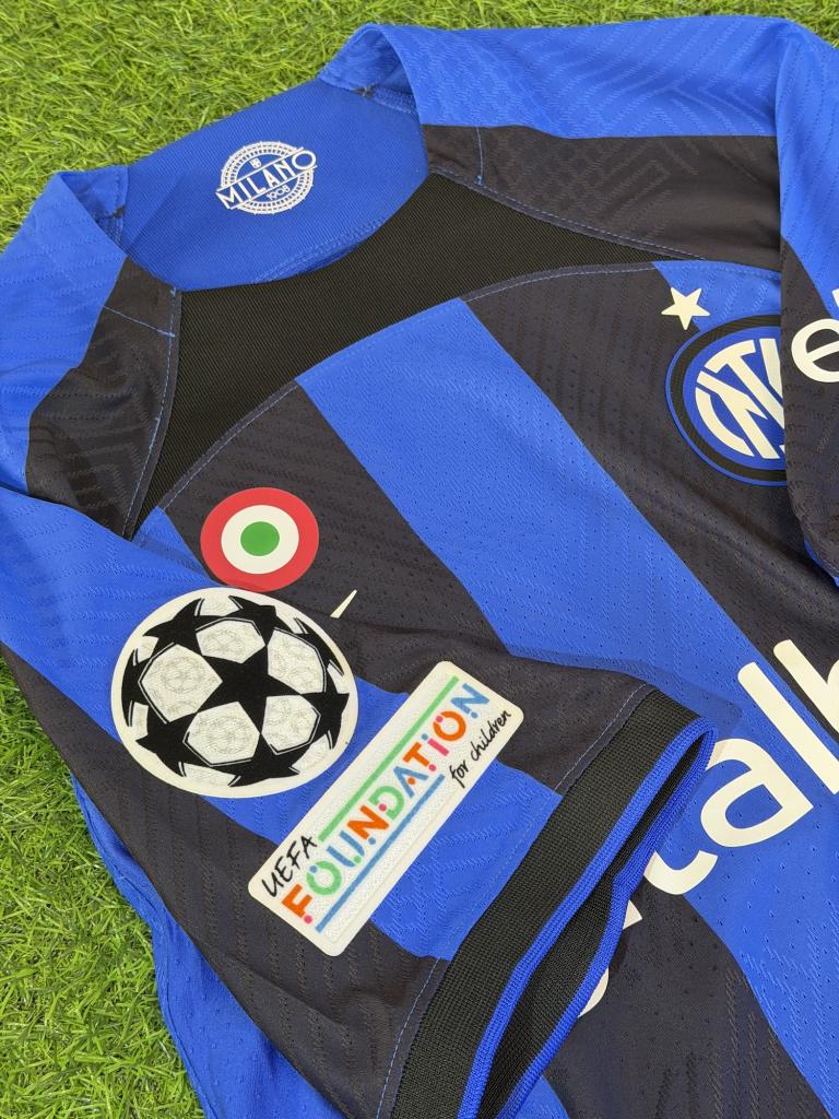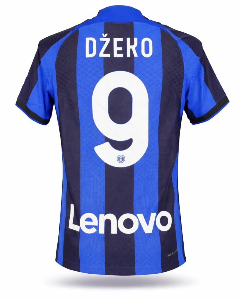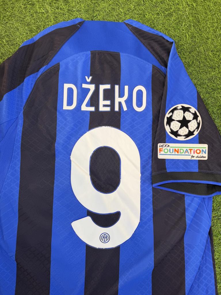 Maglia home dell’Inter stagione 2022/2023 in versione Authentic, personalizzata sul retro con Dzeko 9. Patch ufficiale Champions League.
