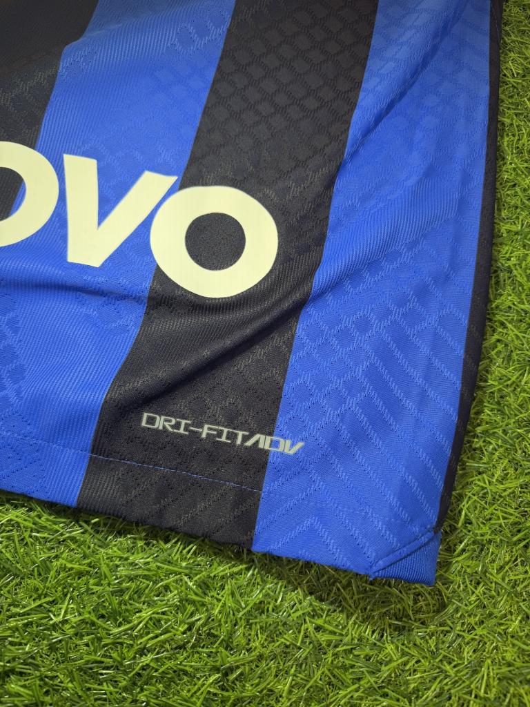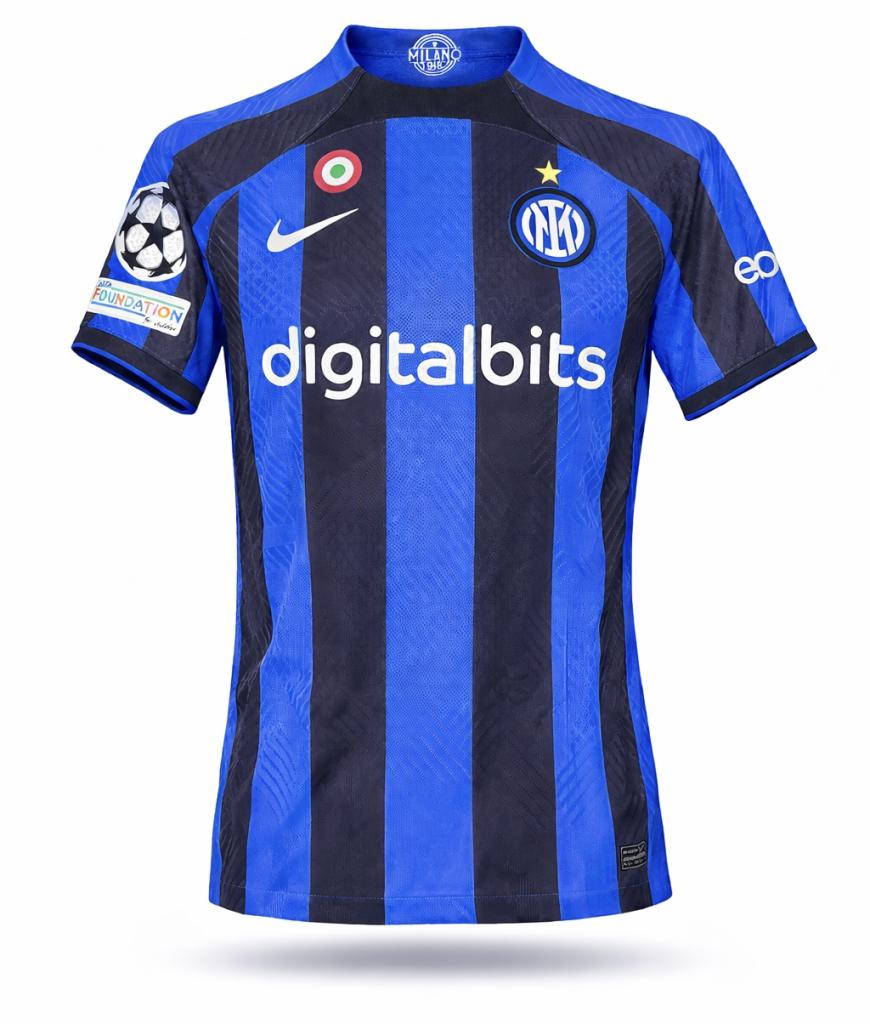 Divisa nerazzurra con bande verticali arricchite da pattern grafici tono su tono, sponsor tecnico Nike e sponsor DigitalBits sul fronte, Lenovo sul retro. Sul petto sono presenti lo stemma Inter con stella e la coccarda tricolore.