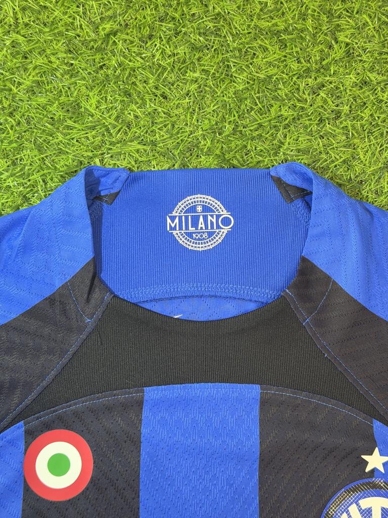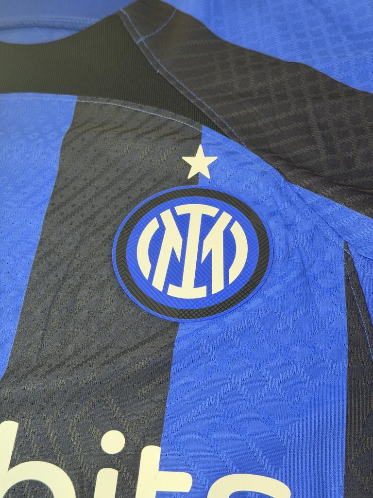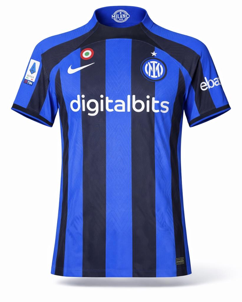 Divisa nerazzurra Home 2022/2023 caratterizzata dalle iconiche bande verticali con pattern grafico tono su tono, sponsor tecnico Nike e sponsor DigitalBits sul fronte, Lenovo sul retro. Sul petto sono presenti lo stemma Inter con stella e la coccarda tricolore.