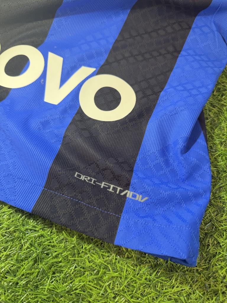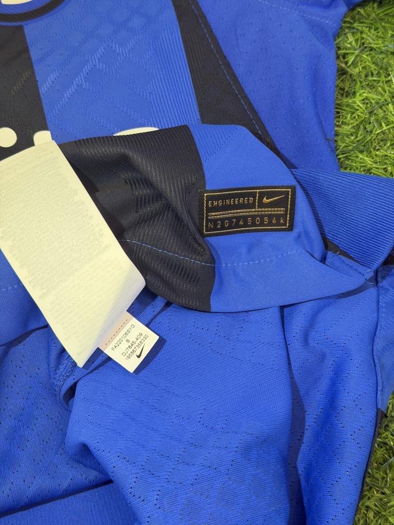 Sul retro nameset ufficiale Barella con numero 23 in bianco. Sulla manica è applicata la patch Serie A TIM, mentre sull’altra è presente lo sponsor eBay. Tessuto Nike Dri-FIT ADV con costruzione leggera e altamente traspirante, inserti tecnici e vestibilità slim tipica delle versioni Player Issued, progettata per l’utilizzo in campo ad alte prestazioni.