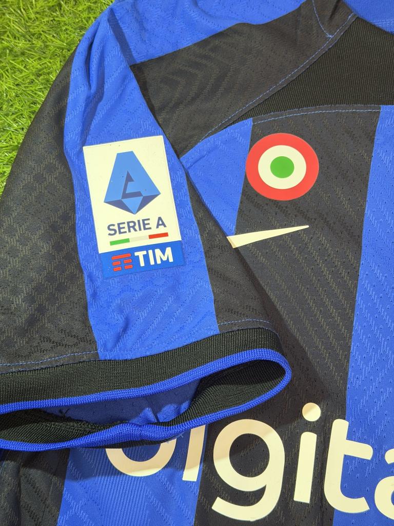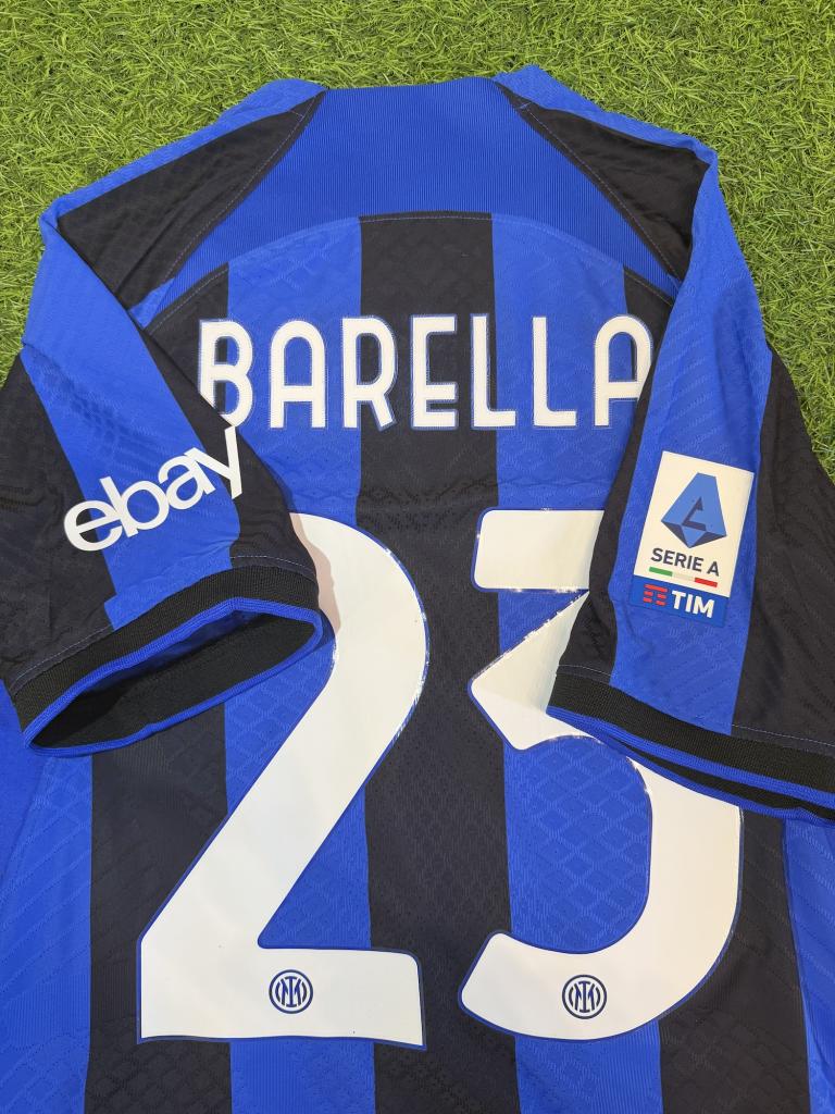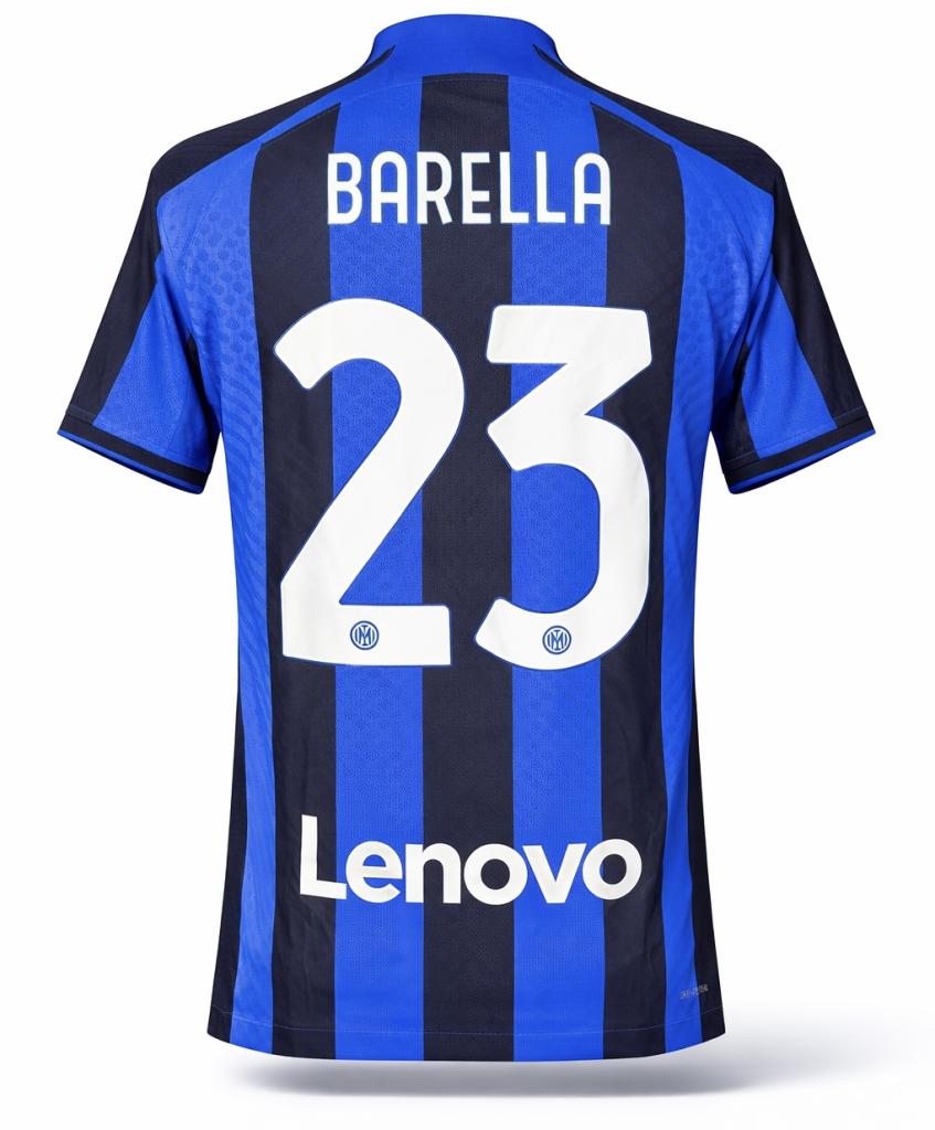 Maglia home dell’Inter della stagione 2022/2023 in versione Authentic, personalizzata Barella 23 con patch ufficiale della Serie A.