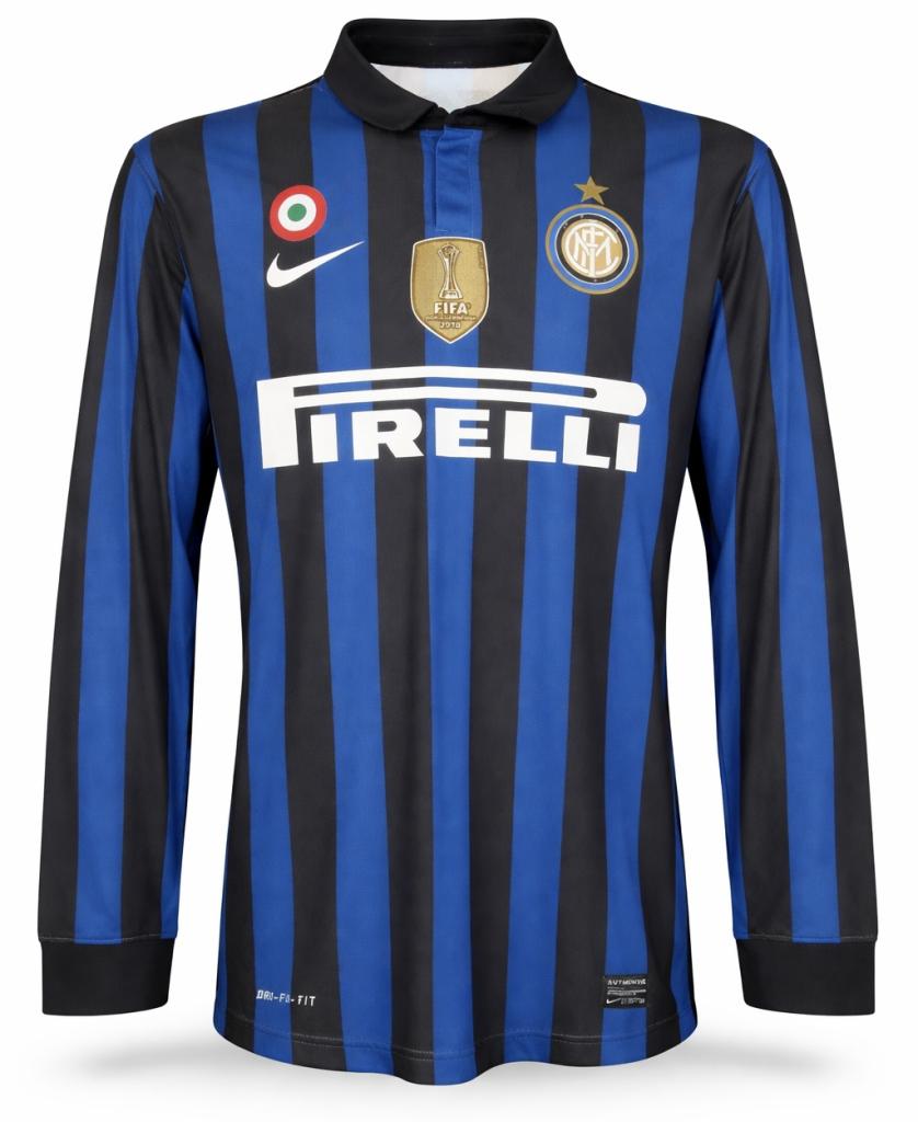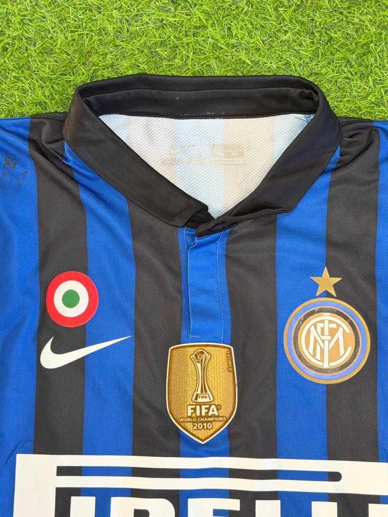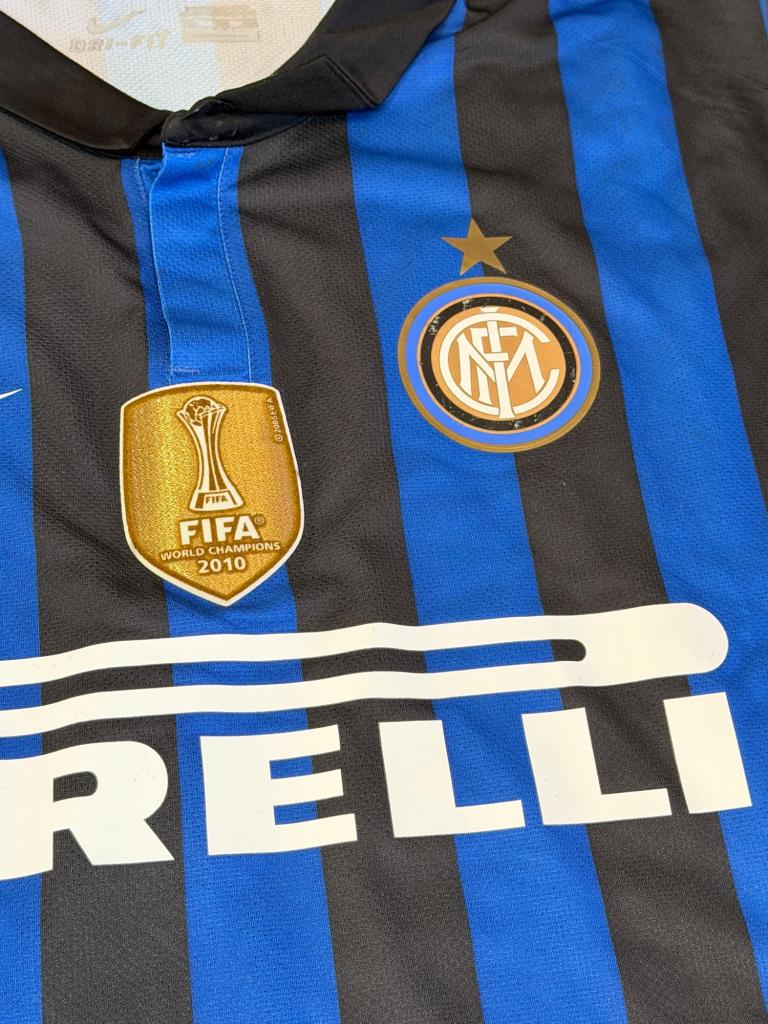 Divisa Home nerazzurra a bande verticali utilizzata nella stagione successiva al Triplete, caratterizzata da colletto polo nero e design Nike. Presenta sponsor tecnico Nike e sponsor commerciale Pirelli, crest Inter con stella e applicazioni ufficiali come patch Scudetto tricolore, FIFA World Champions 2010 e patch Serie A TIM sulla manica.