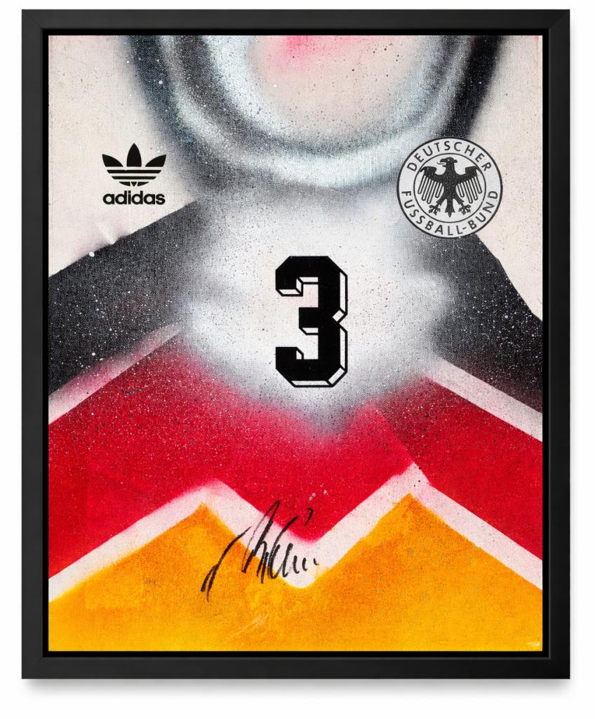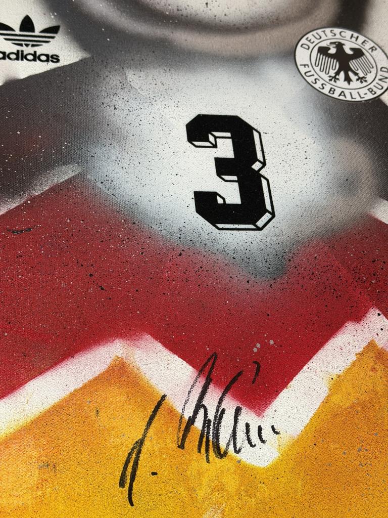 Autografo di Andreas Brehme su tela raffigurante la storica maglia della Germania con numero 3, già incorniciata con cornice nera a battuta. Si tratta di una Legends Painting, concepita come una vera e propria tela artistica contemporanea, con nameset e dettagli applicati sulla superficie, arricchita da una lavorazione grafica con bande nei colori della nazionale tedesca e texture materiche a effetto spray.