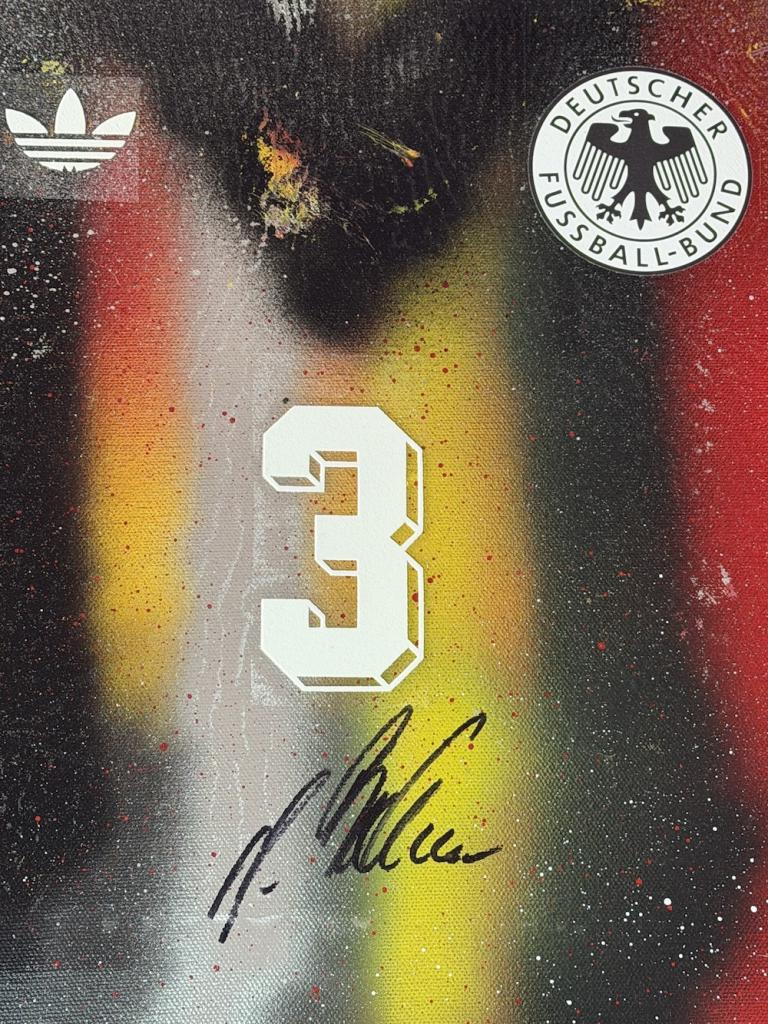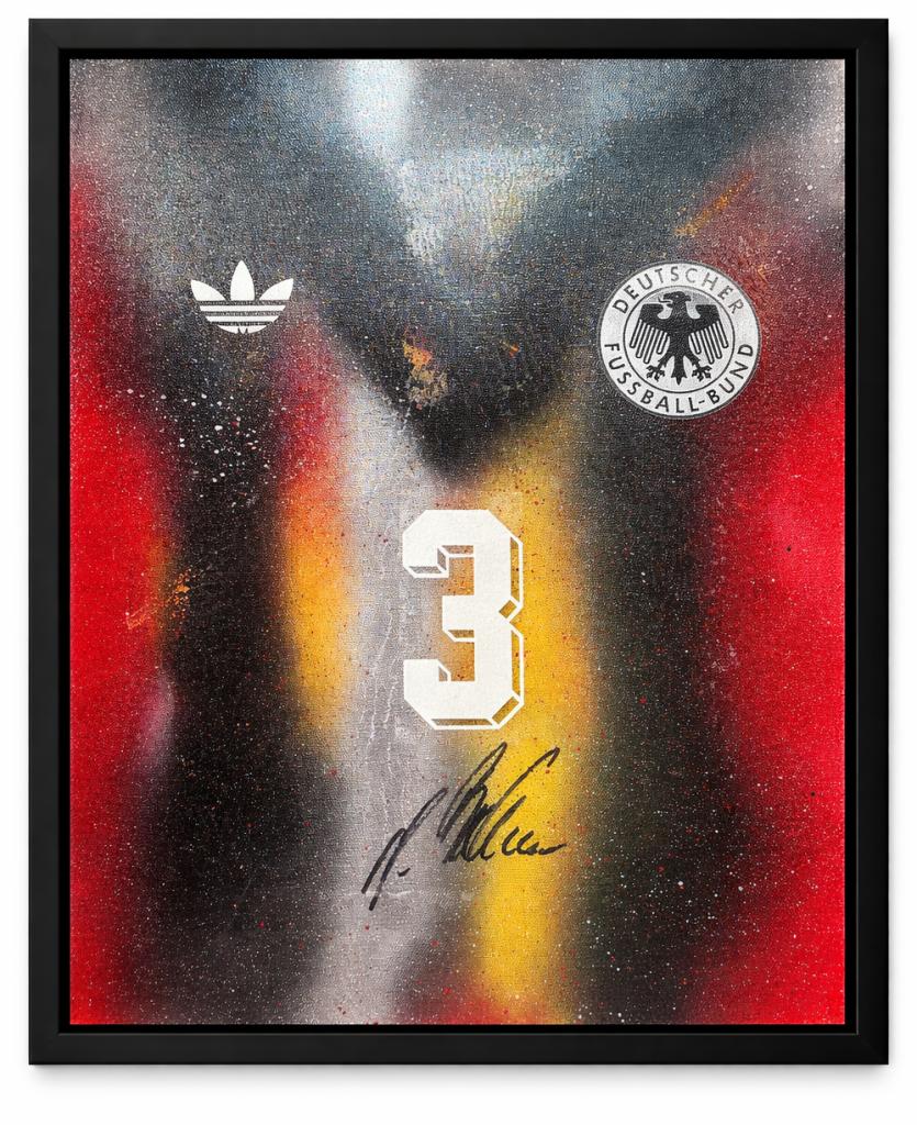 Autografo di Andreas Brehme su tela raffigurante la storica maglia della Germania con numero 3, già incorniciata con cornice nera a battuta. Si tratta di una Legends Painting, concepita come una vera e propria tela artistica contemporanea, con nameset e dettagli applicati sulla superficie, arricchita da una lavorazione grafica nei colori della nazionale tedesca e texture a effetto spray.