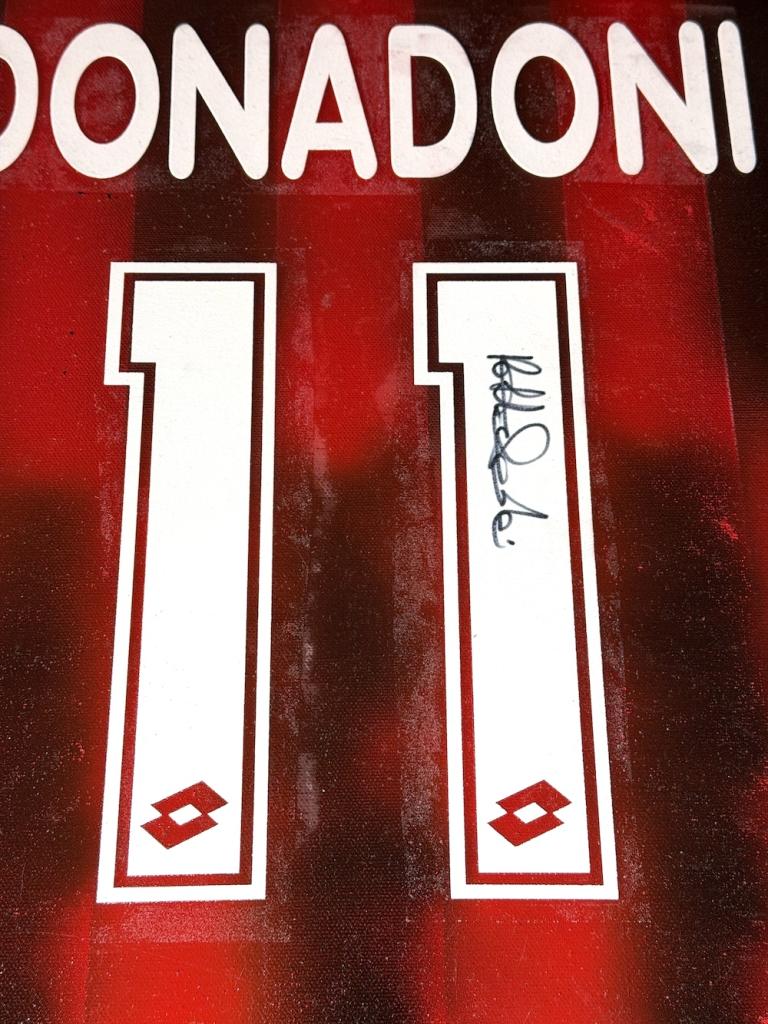 Autografo di Roberto Donadoni su tela raffigurante la storica maglia del Milan con nome DONADONI e numero 11, già incorniciata con cornice nera a battuta. Si tratta di una Legends Painting, concepita come una vera e propria tela artistica contemporanea, con nameset e dettagli applicati sulla superficie, arricchita da una lavorazione grafica nei colori rossoneri e texture a effetto spray.