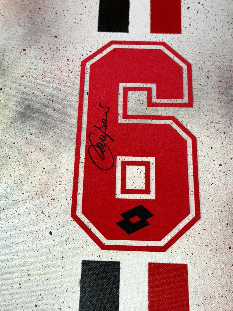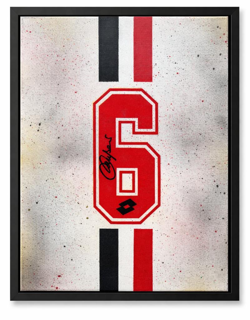 Autografo di Franco Baresi su tela raffigurante la storica maglia del Milan con numero 6, già incorniciata con cornice nera a battuta. Si tratta di una Legends Painting, concepita come una vera e propria tela artistica contemporanea, con nameset e dettagli applicati sulla superficie, arricchita da una lavorazione grafica nei colori rossoneri con inserti tricolore e texture a effetto spray.