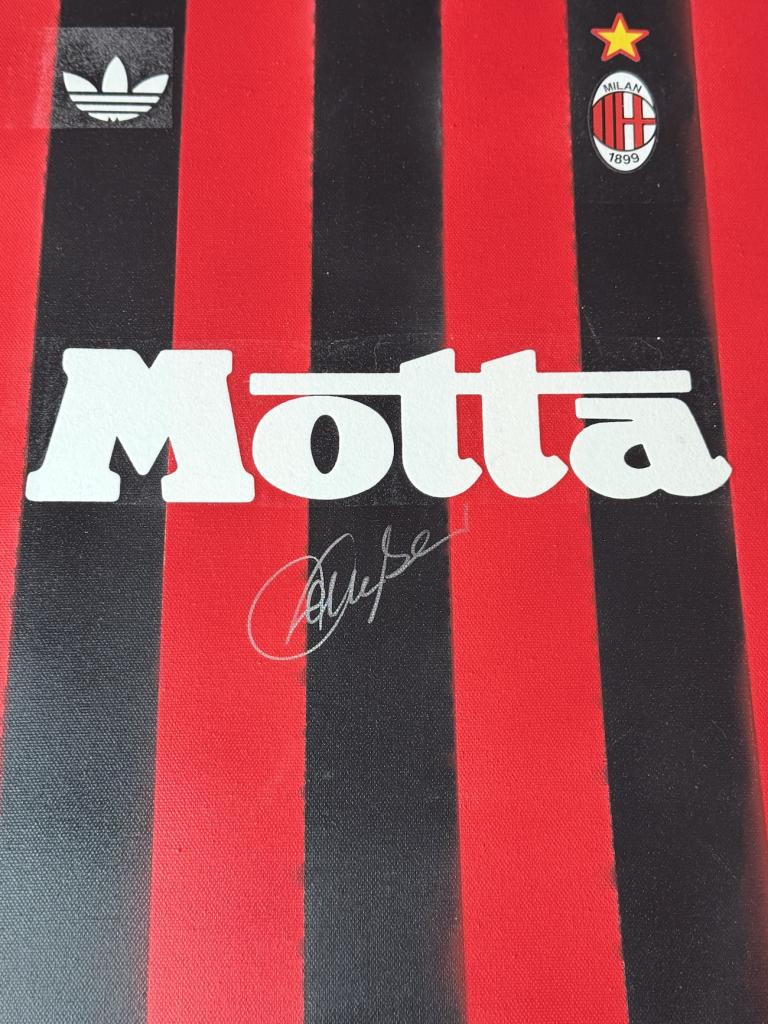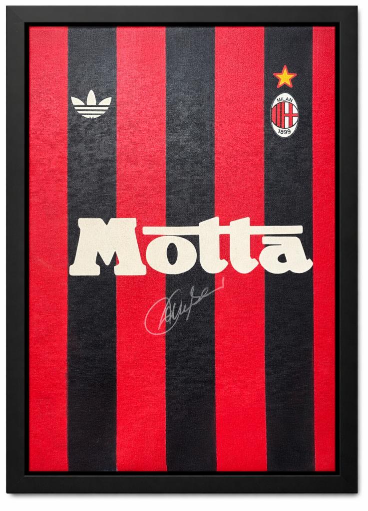 Autografo di Franco Baresi su tela raffigurante la storica maglia del Milan con sponsor Motta e stemma societario, già incorniciata con cornice nera a battuta. Si tratta di una Legends Painting, concepita come una vera e propria tela artistica contemporanea, con nameset e dettagli applicati sulla superficie, arricchita da una lavorazione grafica nei colori rossoneri e texture a effetto spray.