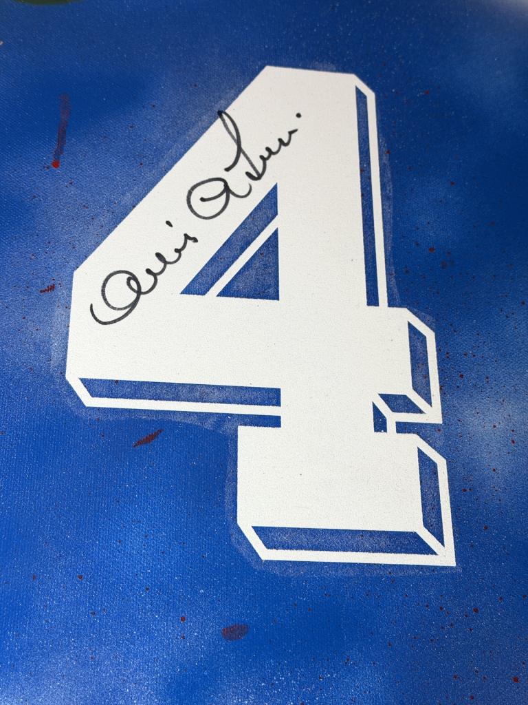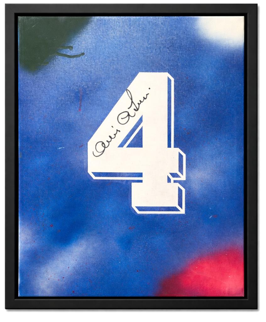 Autografo di Antonio Cabrini su tela raffigurante il numero 4 ispirato alla maglia della Nazionale italiana, già incorniciata con cornice nera a battuta. Si tratta di una Legends Painting, concepita come una vera e propria tela artistica contemporanea, con nameset e dettagli applicati sulla superficie, arricchita da una lavorazione grafica nei toni dell’azzurro con inserti cromatici e texture a effetto spray.