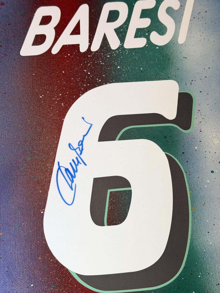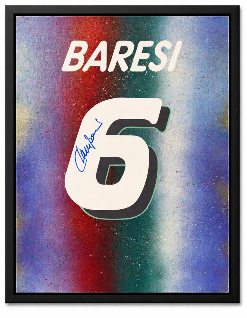 Autografo di Franco Baresi su tela raffigurante la storica maglia dell’Italia con nome BARESI e numero 6, già incorniciata con cornice nera a battuta. Si tratta di una Legends Painting, concepita come una vera e propria tela artistica contemporanea, con nameset e dettagli applicati sulla superficie, arricchita da una lavorazione grafica nei colori della bandiera italiana e texture a effetto spray.