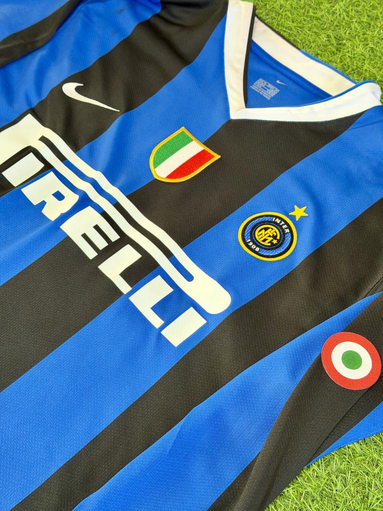 Divisa Home nerazzurra con iconiche bande verticali nere e blu, caratterizzata dal colletto a V bianco che dona un contrasto elegante. Sul petto sono presenti lo sponsor tecnico Nike, lo sponsor commerciale Pirelli e lo scudetto tricolore, simbolo del titolo conquistato nella stagione precedente, affiancato dal crest Inter con stella. Le maniche sono lunghe e senza nessuna patch applicata.